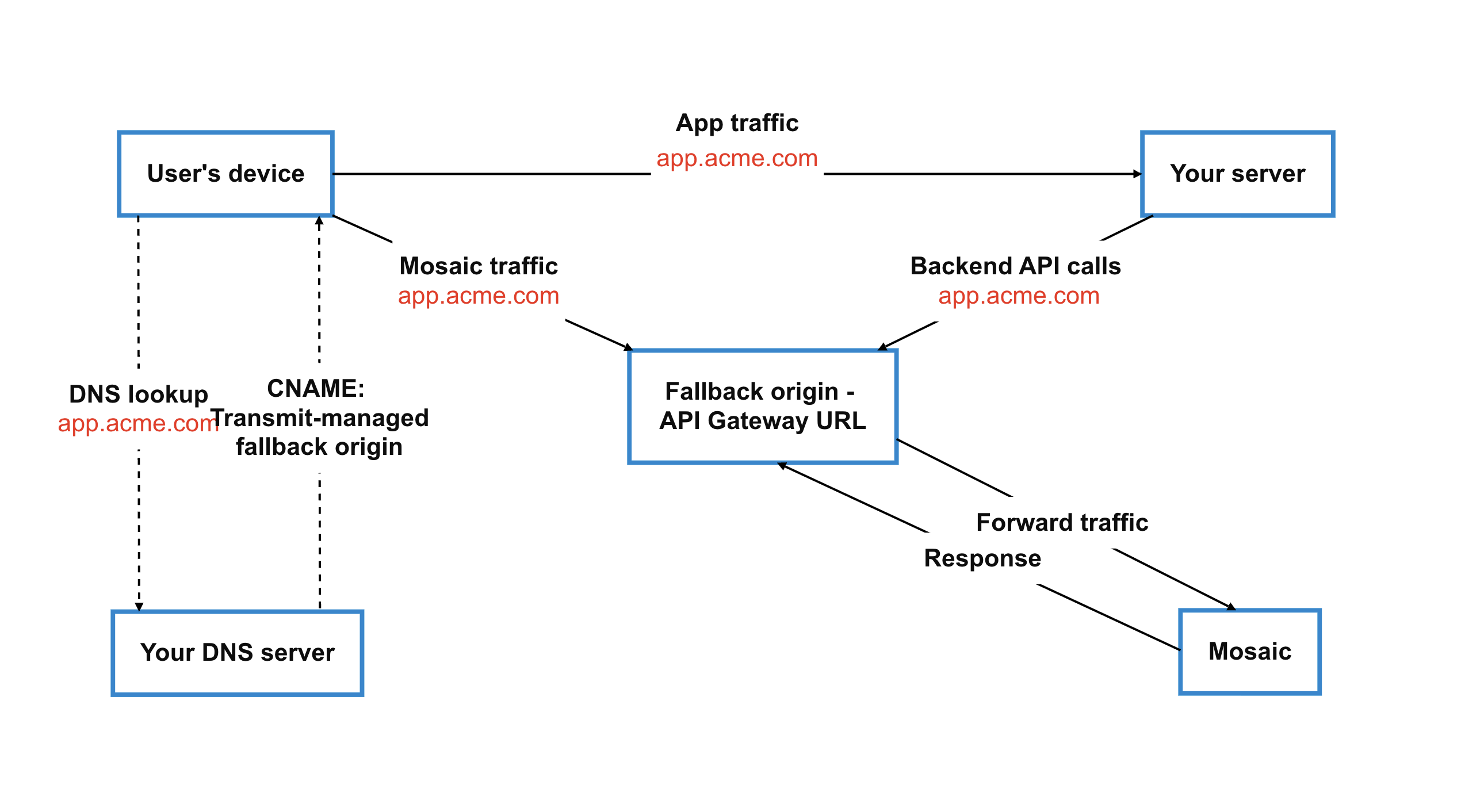 - Adding a CNAME record pointing your custom hostname to the fallback origin (API Gateway URL) provided by Transmit Security