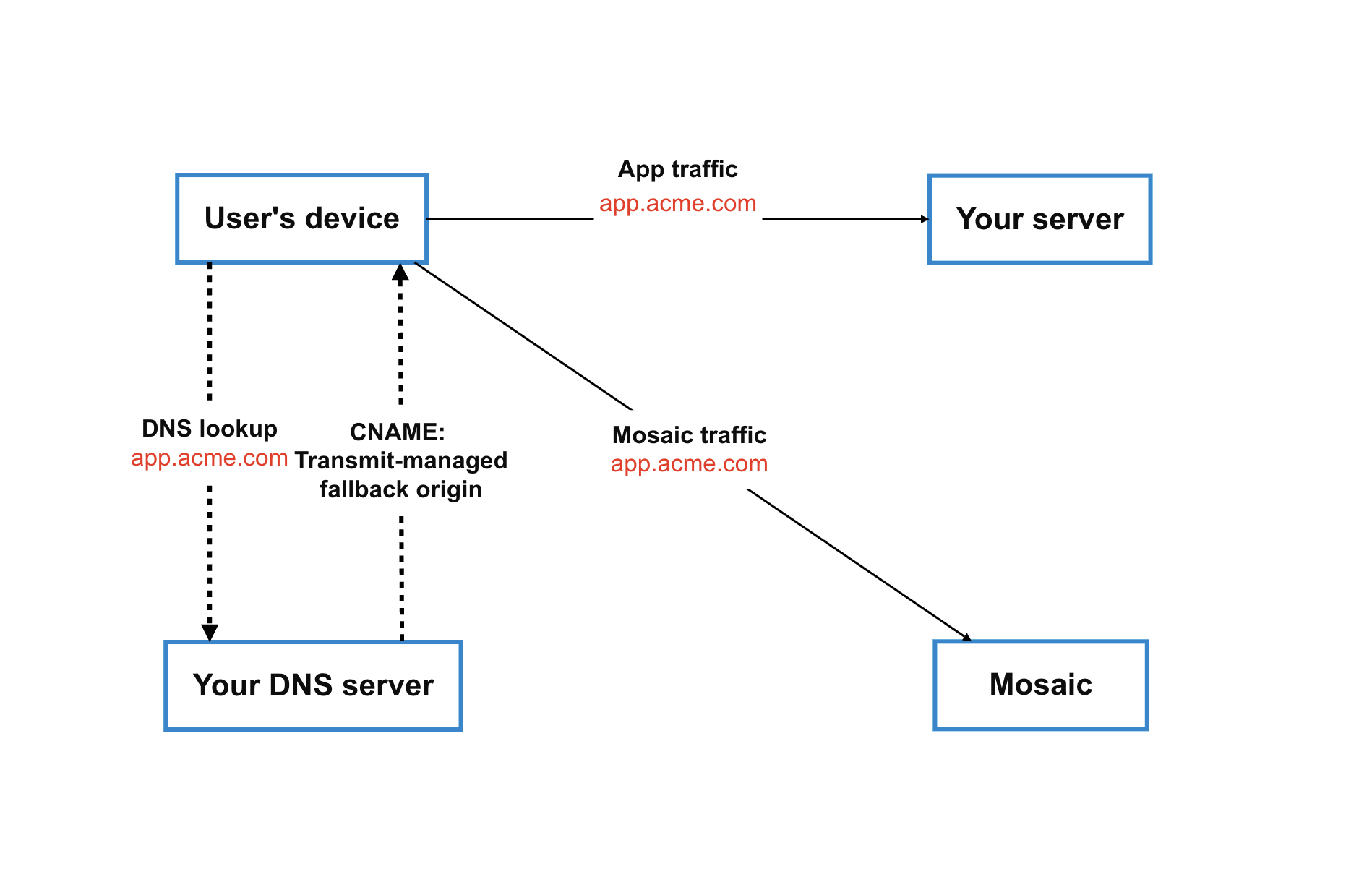 In the diagram below, app.acme.com is your main subdomain, mosaic.acme.com is a CNAME record that points to Mosaic (api.transmitsecurity.io). Whenever a user's device needs to send data to Mosaic, DNS lookup resolves the mosaic.acme.com CNAME to Mosaic.