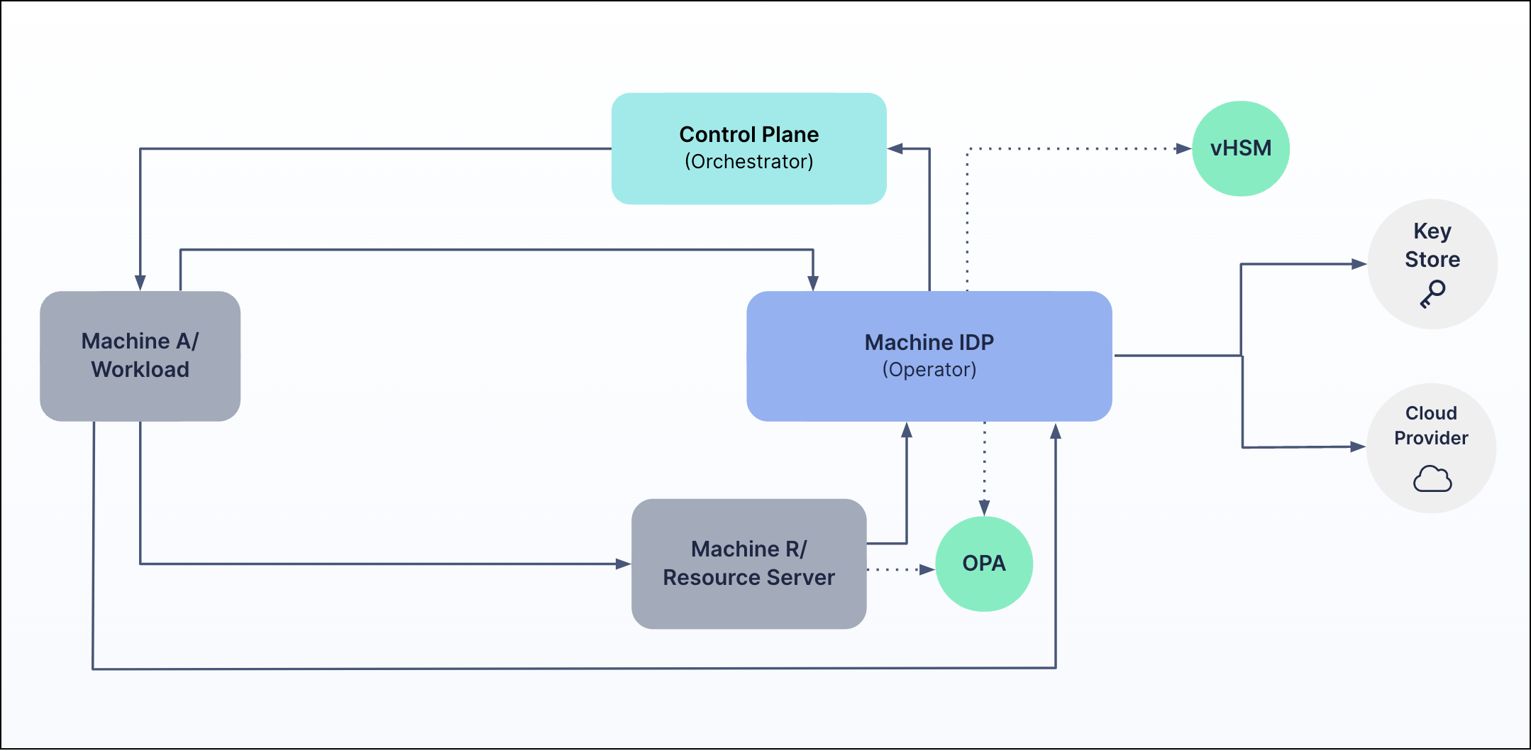 Control plane - (Orchestrator) Admin that manages workloads and issues tickets to register new workload identities and manage their access