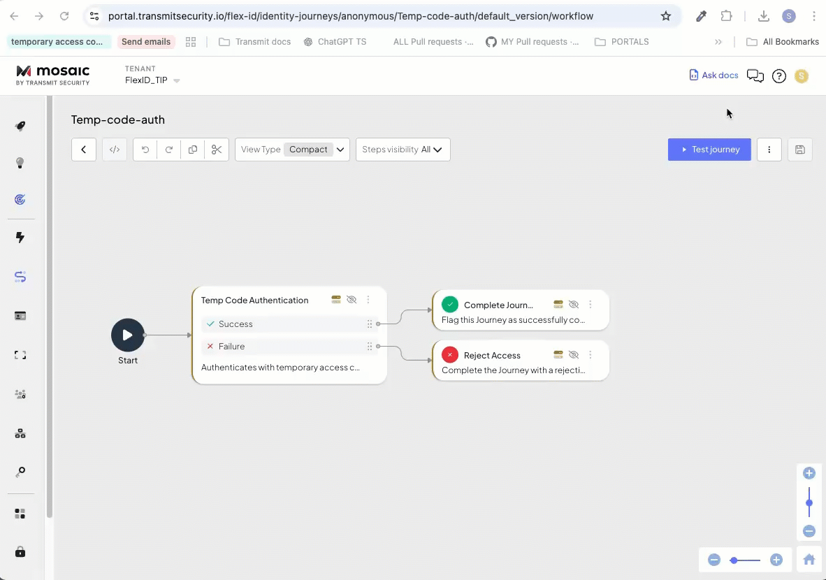 Before running the downloaded project, you can use the Test Journey option in the Identity Journey editor. This feature provides a browser-based simulation of the journey, allowing you to test its behavior with different inputs.