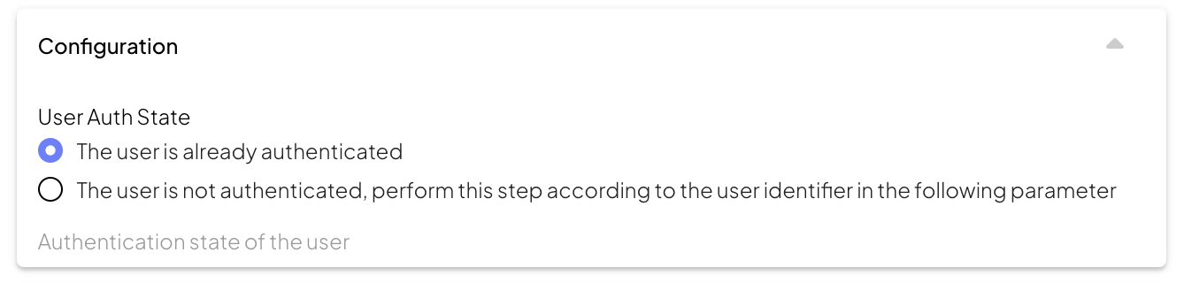 To ensure security, the User Auth State control appears in steps that involve accessing or modifying user data. This control allows you to define the expected authentication state for each step, so that the journey can adapt dynamically to the user’s current status. The User Auth State control provides two options: