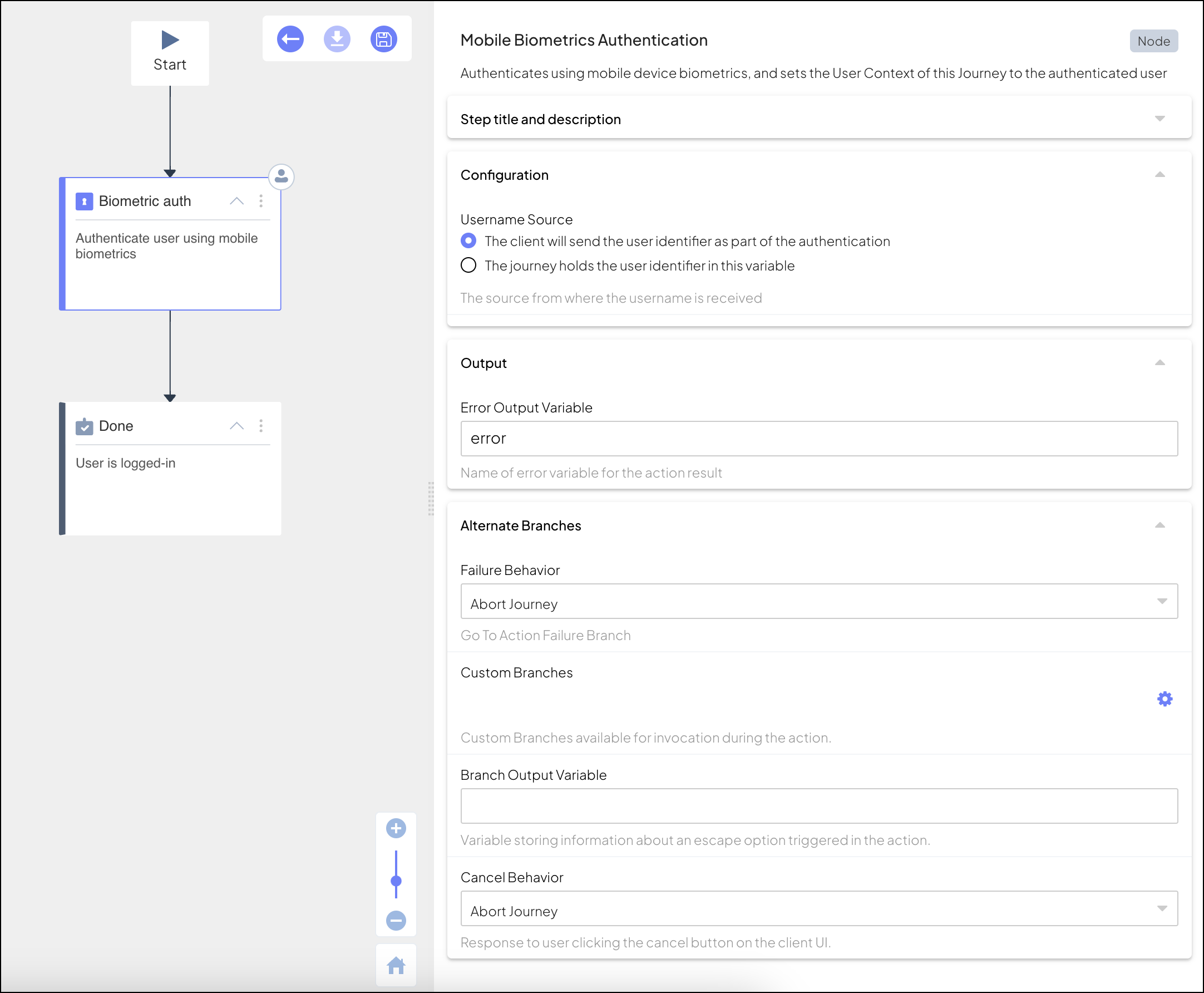 When executed, this step sends a callback to the client with the IDO service response object. It will have the journeyStepId set to authenticateNativeBiometrics and the data will include a challenge generated implicitly by the IDO service. The client authenticates the user using their biometric credentials, and signs the challenge. The client then returns the authentication result to the journey to complete the step.