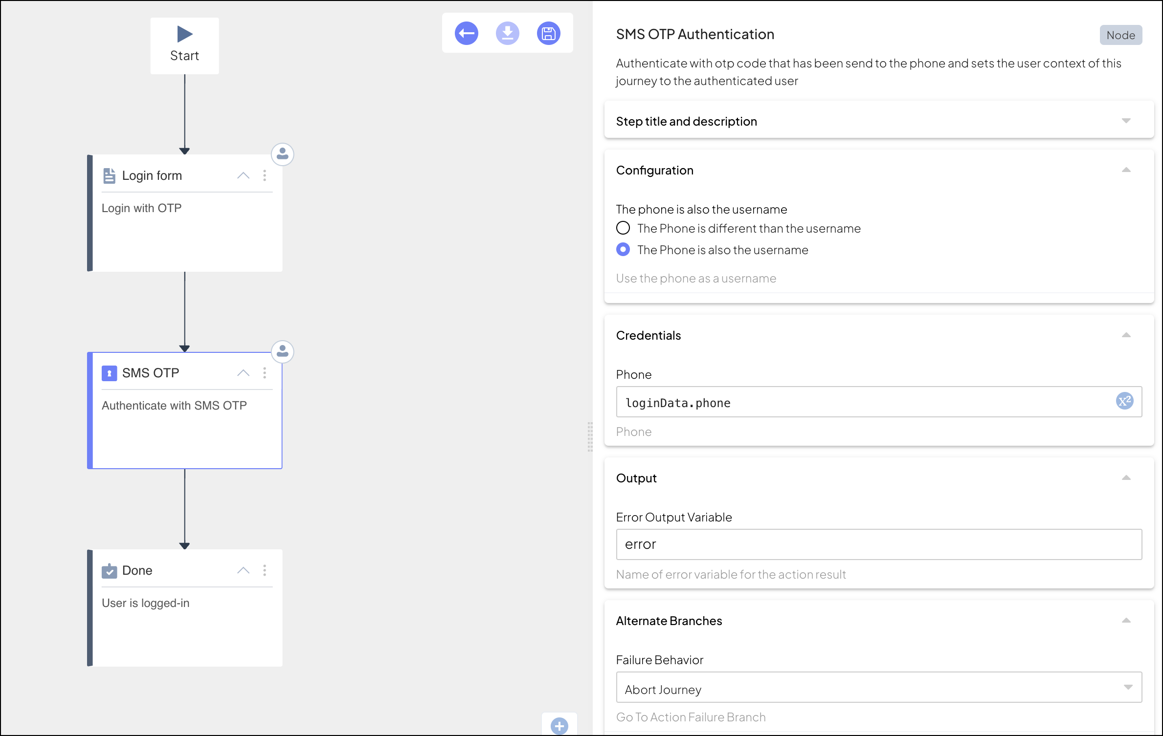 Suppose a login form is used to collect the user's phone number, which is also the user identifier in our example. The form ID is loginForm, the input will be stored in a variable named loginData, and only SMS OTP is enabled. The OTP branch has the default branch ID (sms_otp) and schema is updated to expect only phone number (phone).
