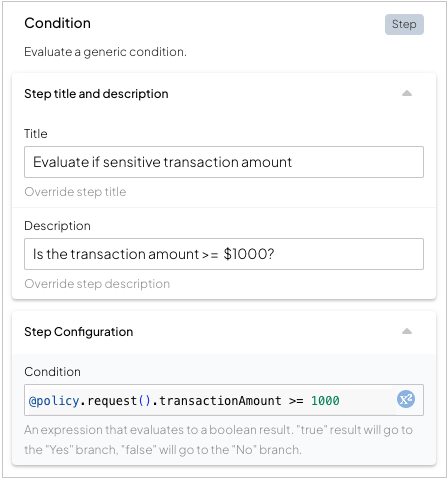 Suppose a condition is used to determine whether to proceed to a step-Up authentication branch or allow the user to complete a transaction directly. The decision is based on whether the transaction amount is equal to or exceeds $1000: @policy.request().transactionAmount >= 1000.