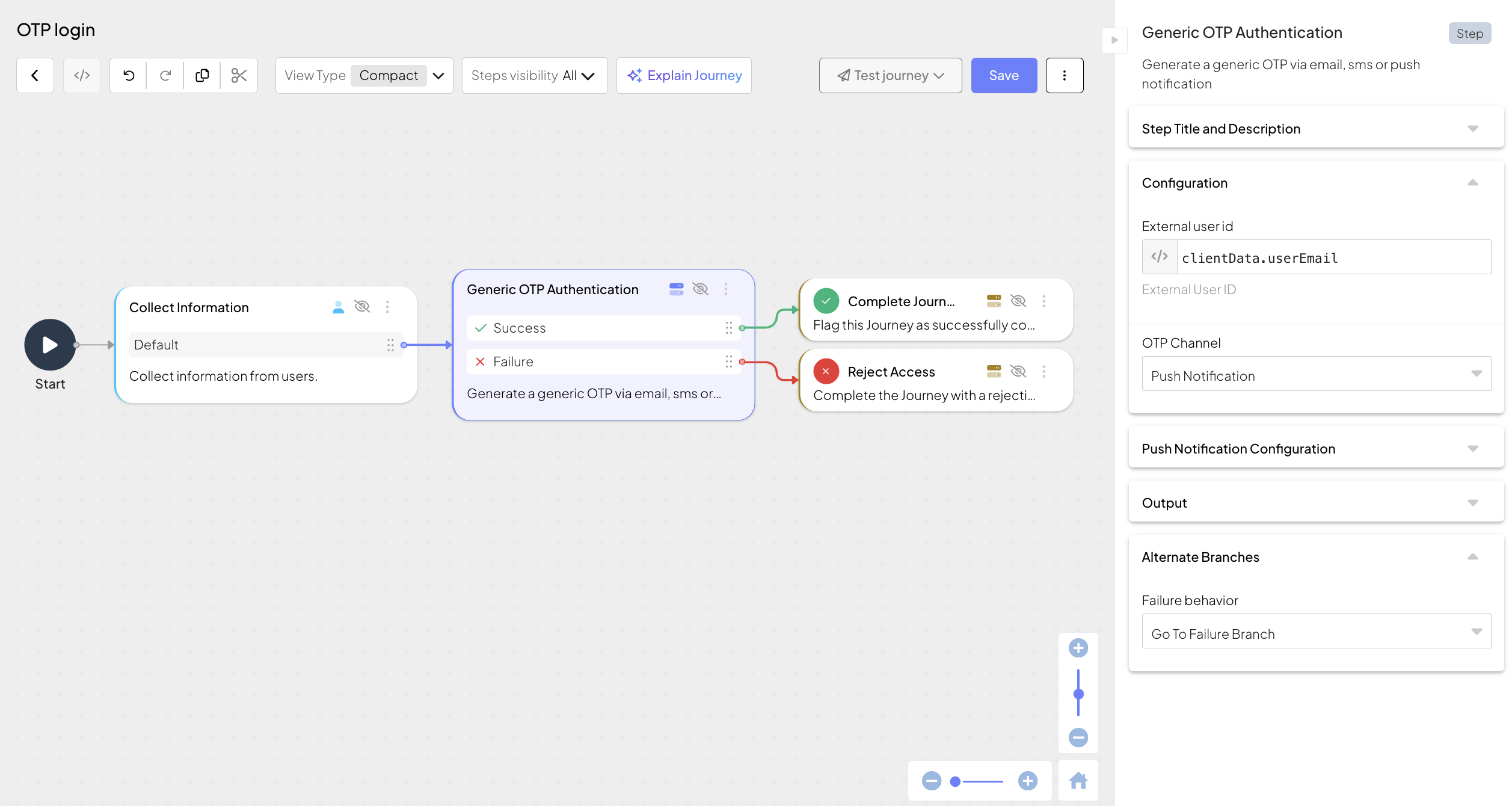 - Select the OTP channel in the step configuration (SMS, Email, or Push).