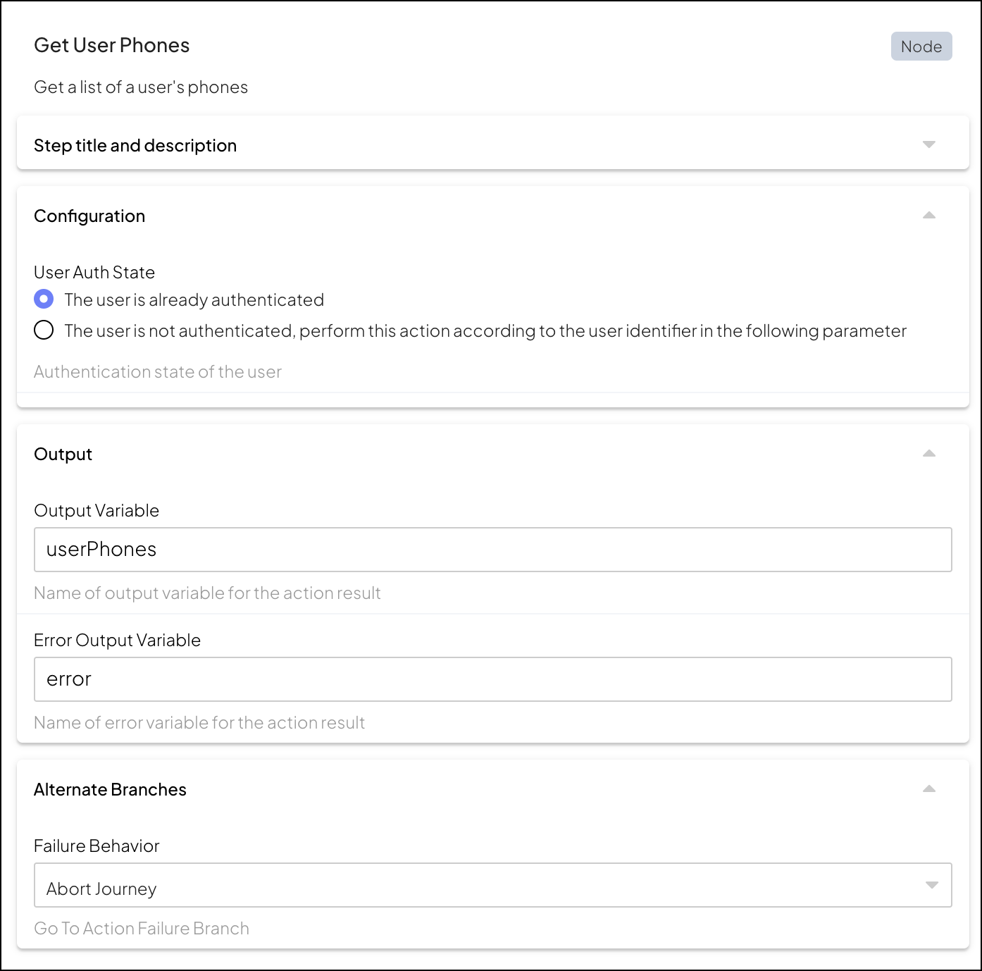 If the step is successfully completed, the journey returns the phone numbers from the user's profile and continues to the next step. If it fails, the journey proceeds to an step failed branch (if one is specified); otherwise, the journey is aborted and an error is sent to the client.
