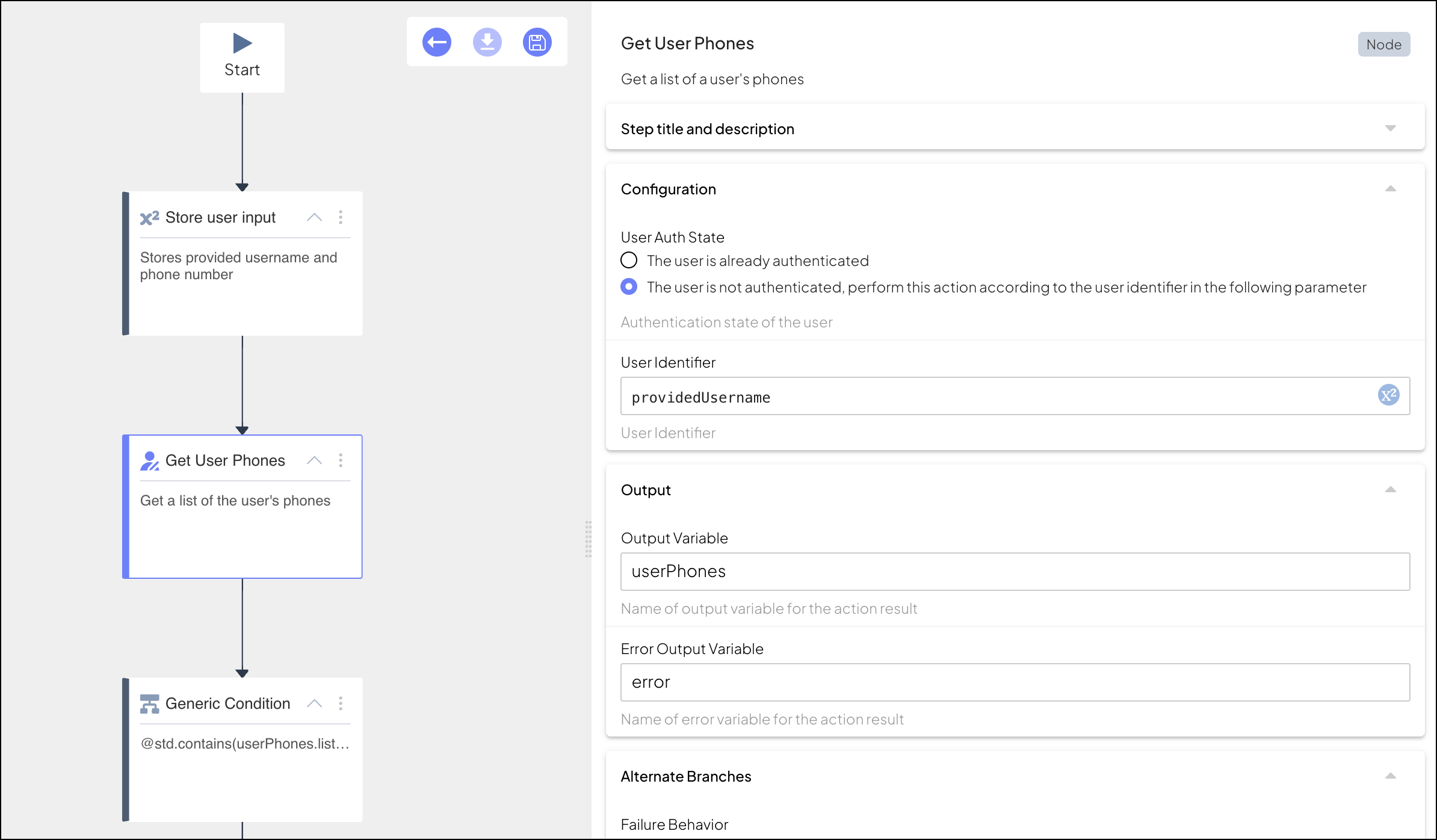 Building on the first example, suppose that we want to check if an phone number provided by the user is a known phone number for this user (assuming the phone number is different than the username). In our example, the username and phone number provided by the user are stored in variables named providedUsername and providedPhone, respectively. This step is configured to retrieve the phone numbers for providedUsername and store them in userPhones.