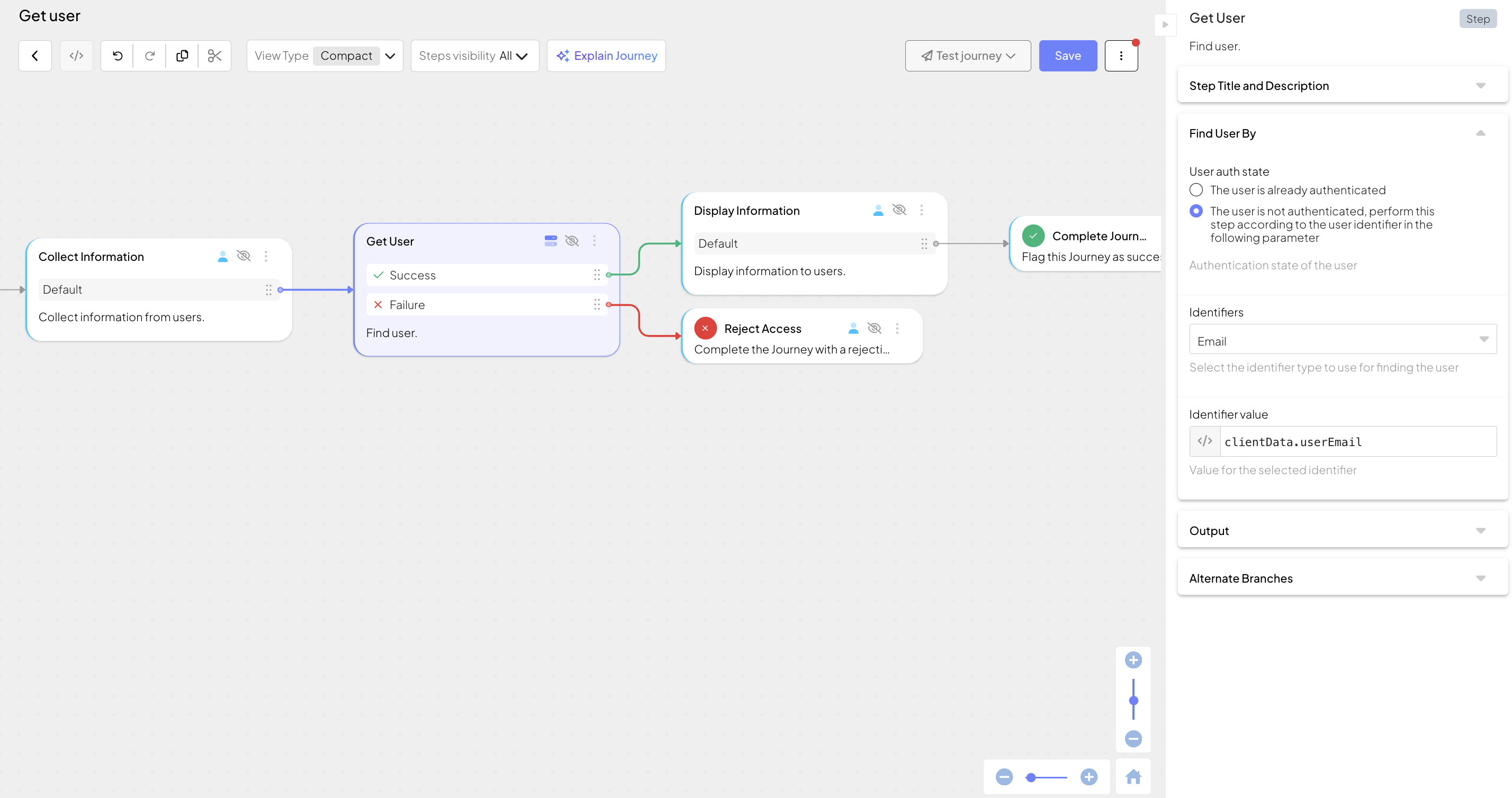 If the step is successfully completed, the user profile (including custom attributes) is stored in the configured output variable and the journey continues. If it fails, the journey proceeds according to the configured failure behavior.