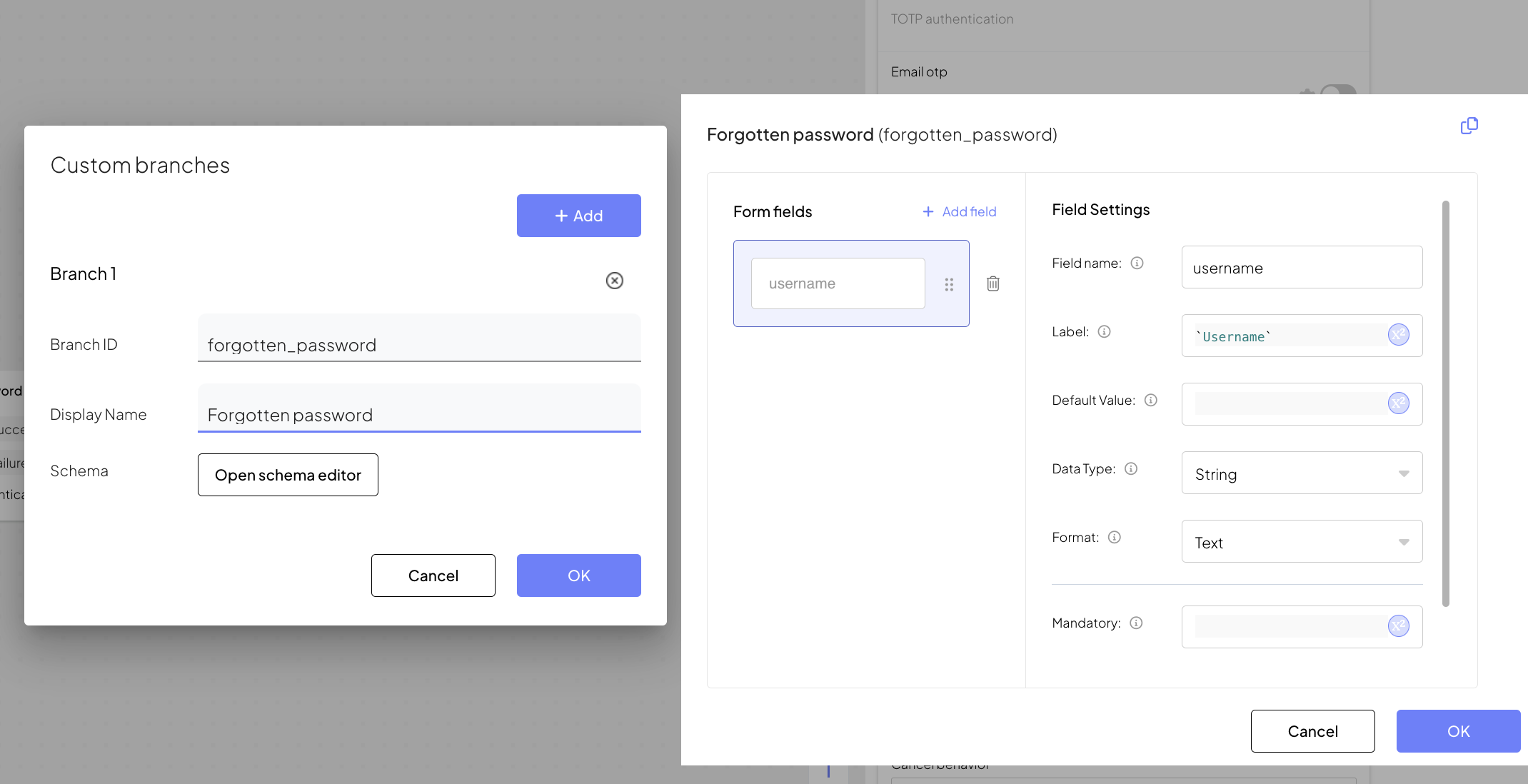});Building on the first example, suppose the login form for password authentication also includes an option the user can choose in case they forgot their password. In this example, a custom branch (forgotten_password) is added to the step, which automatically creates a new branch that will be used to execute the recovery flow. For this branch, the schema includes just the username field.