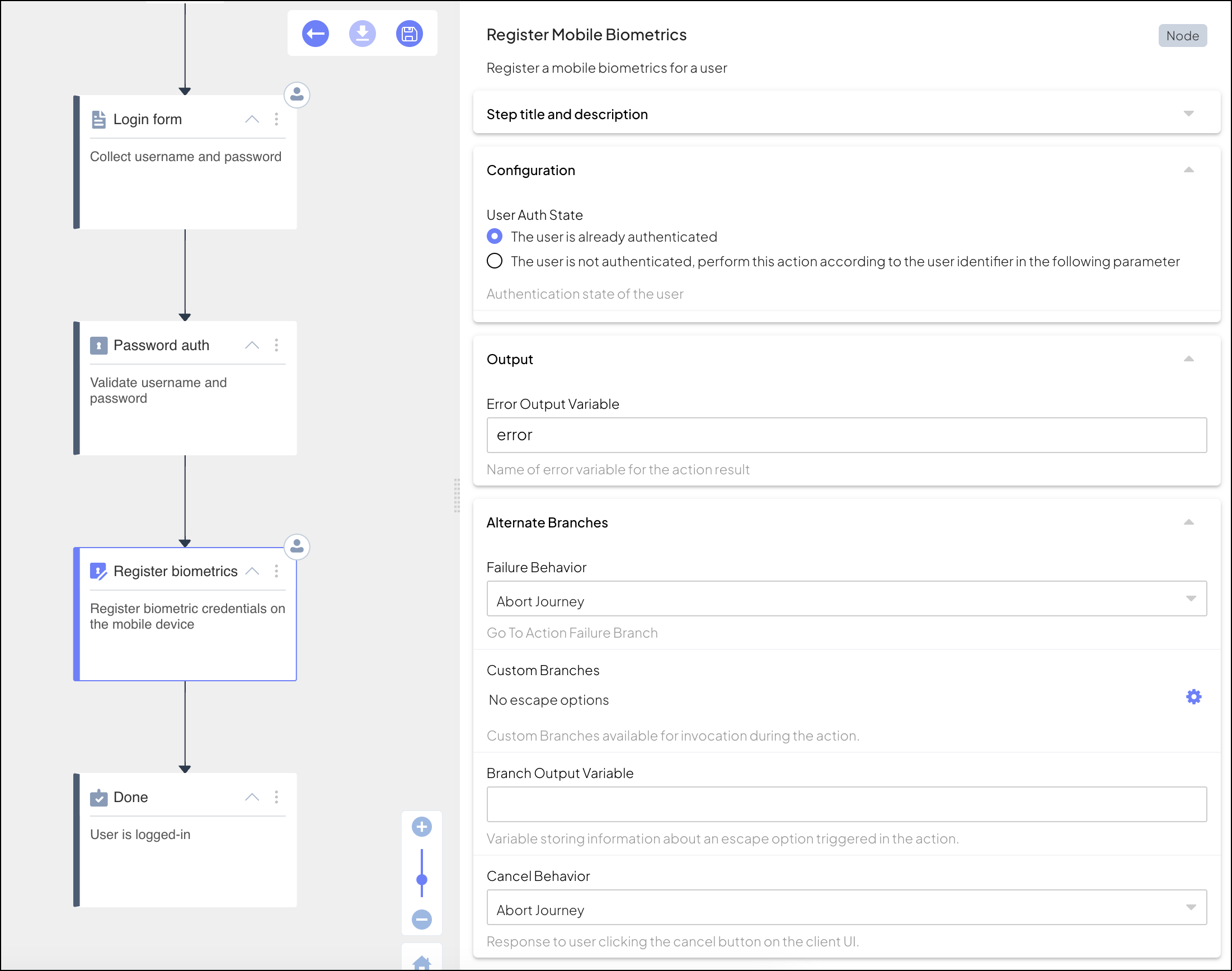 Consider a journey that authenticates the user (e.g., using password) before initiating a biometric registration. In our example, the User Auth State is set to The user is already authenticated in the step configuration.