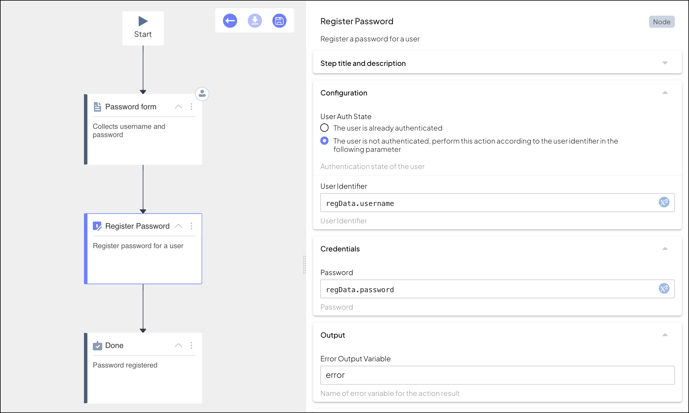 Consider a registration form that allows the user to choose a username and password, which is created using the Collect information step. In our example, the step ID is regForm, the schema contains username and password, and the information will be stored in a variable named regData. In the Register Password step, both the user identifier and password are obtained from the form output (using regForm.username and regForm.password).