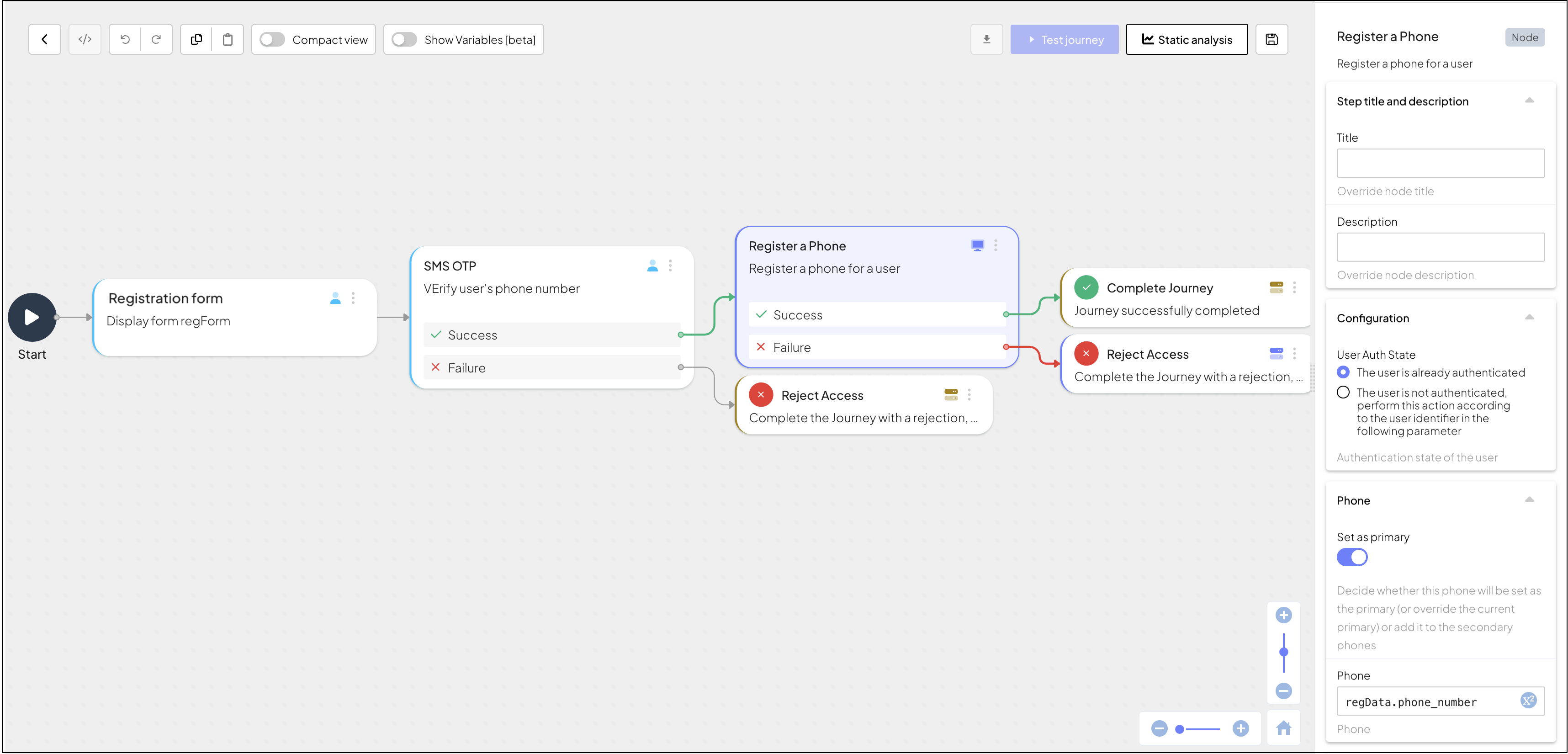 After verifying the phone number (e.g., using a SMS OTP), the Register a Phone step is used to add the phone number for this user. Since an SMS OTP authentication was performed, the user is authenticated and the user context is provided by the journey. The phone number can be retrieved from the form output using regForm.phone_number: