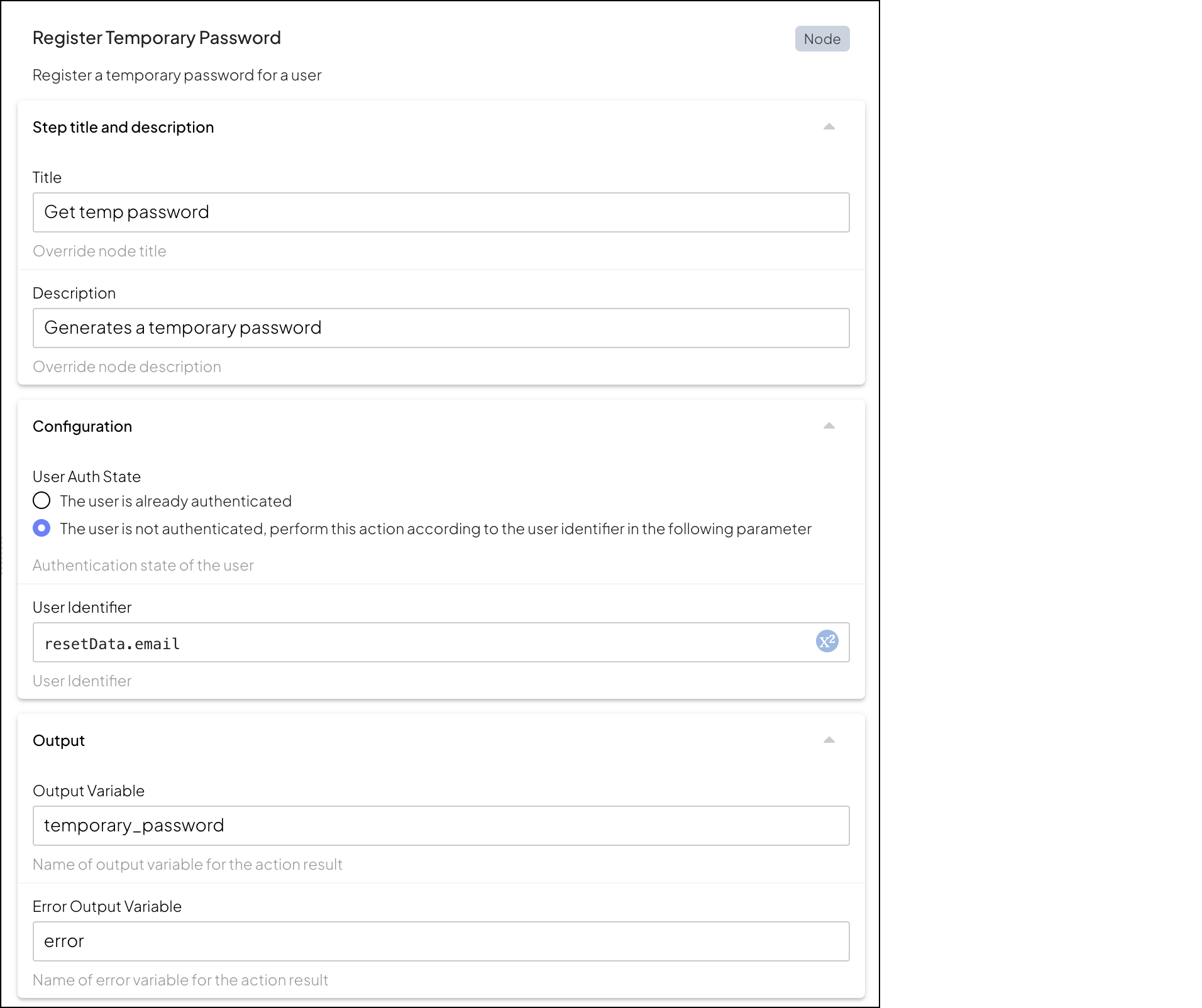 Consider a password reset flow for a user that forgets their password. Suppose a form collects the user's email which is also their username (using the Collect information step). This step obtains the user identifier from the form output (resetData.email in our case) and stores the generated password in a variable named temporary_password.