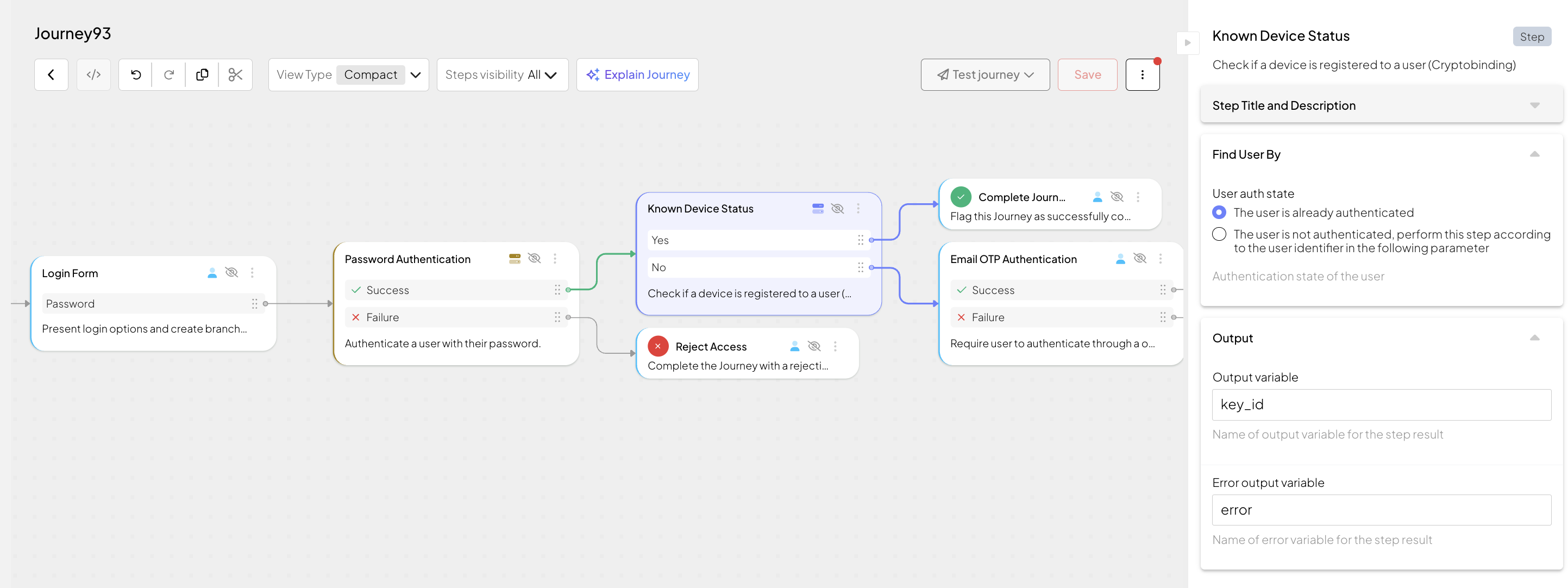 If the device is known for this user, the journey proceeds to the Success branch. If the device is unknown, you can design the journey to proceed with registering the device for a verified user or implement any other necessary actions.