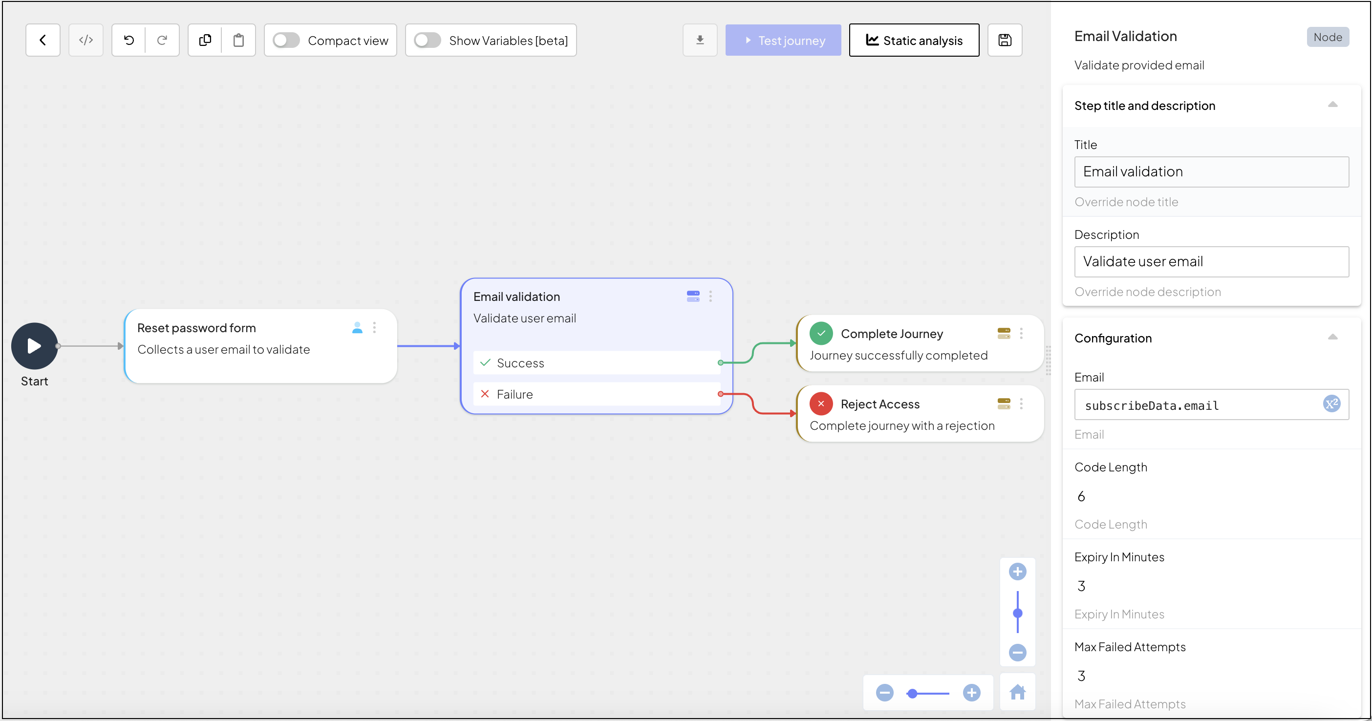 This step requires the email to send the code to. Once initiated, this step sends an OTP to the specified email and then asks the client to send it back to the journey. The client retrieves the code from the user and submits it to the journey for validation, proving the user has access to the indicated address.