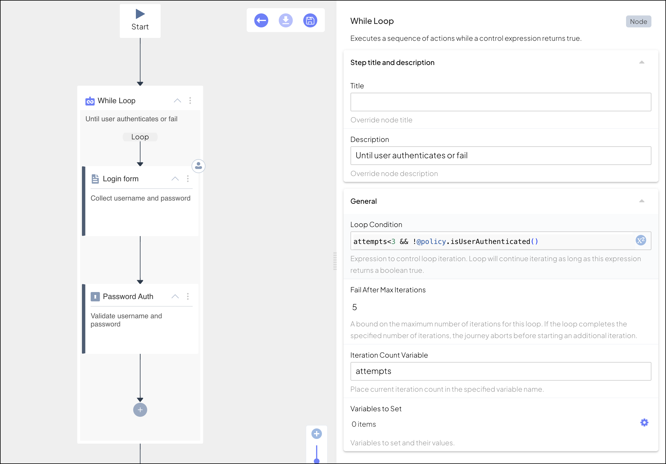 Suppose we want to limit the number of unsuccessful authentication attempts before failing the journey. In our example, the loop body contains a sequence of steps for password authentication. The loop is configured to repeat as long as the user remains unauthenticated using !@policy.isUserAuthenticated(), with up to 5 retries before failing the journey.