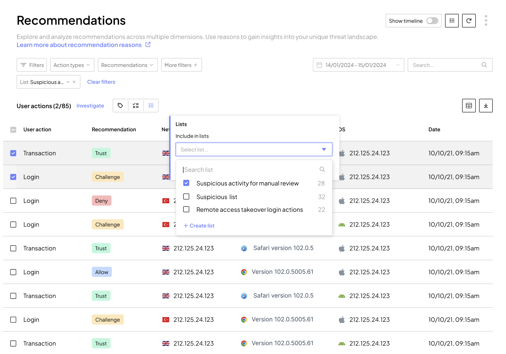 Streamline fraud management and risk mitigation by dividing recommendations on user actions captured by Mosaic into categories and organizing them into lists based on risk recommendations or indicators related to the user, device, and network. With lists, the fraud response team can gain a better understanding of the attack landscape and prioritize reviewing certain types of user actions over others.