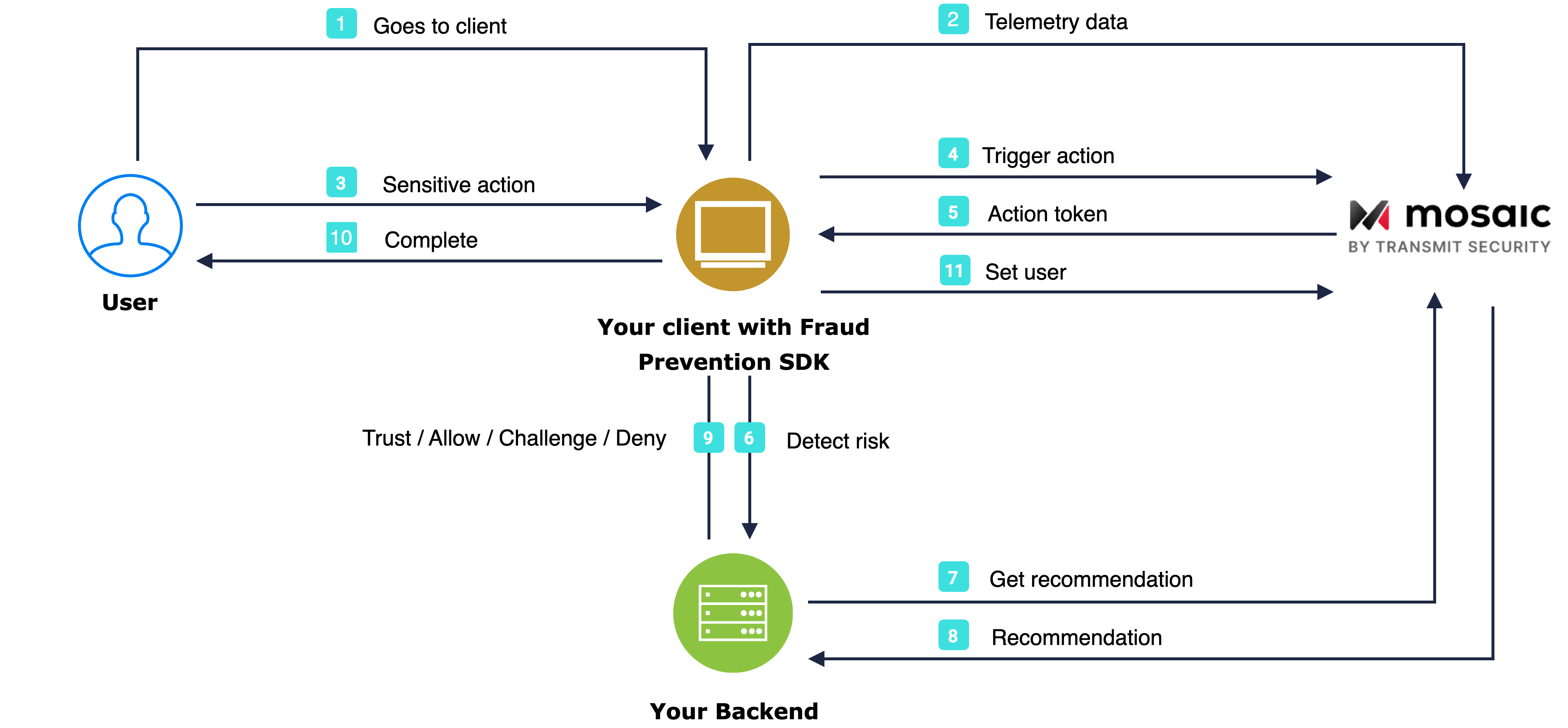 The flow starts with the user navigating to the webpage (1). The SDK gets initialized and starts sending telemetry to Mosaic (2). When a user performs an action, for example, clicks a login button (3), the SDK triggers an action event (4) and obtains an action token (5) which then forwards to the backend (6). Having received an action token, the application backend uses it to fetch recommendation from Mosaic (7 & 8) and instructs the client to act accordingly (9) in order to complete the login procedure (10). Upon successful login, the client sets the user (11).