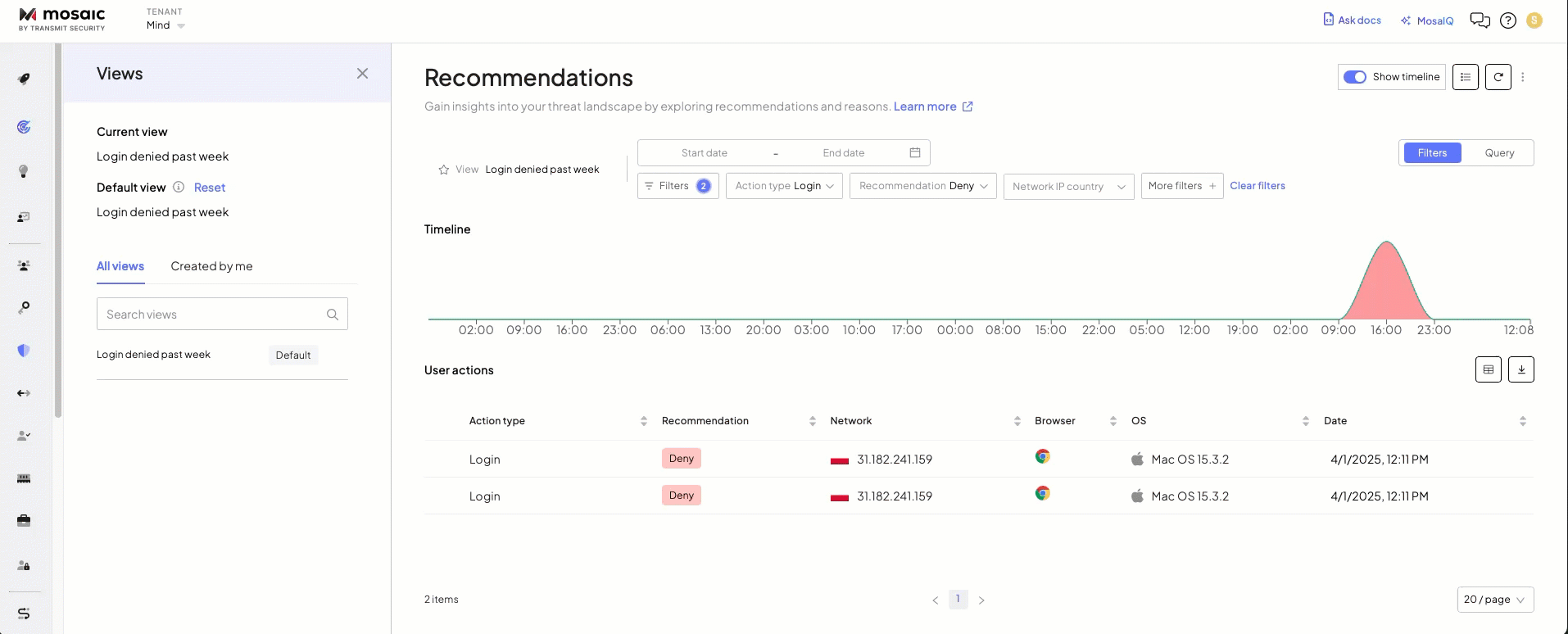- "Denied logins – past 7 days" to monitor login attempts flagged as high-risk.
