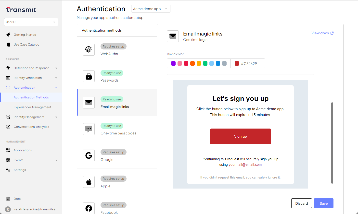 Email templates are used for various authentication methods, such as email magic link, email OTP, and password reset emails. From the authentication method settings (B2C or B2B Identity based on your setup > Authentication methods), you customize the email primary color and preview its appearance.