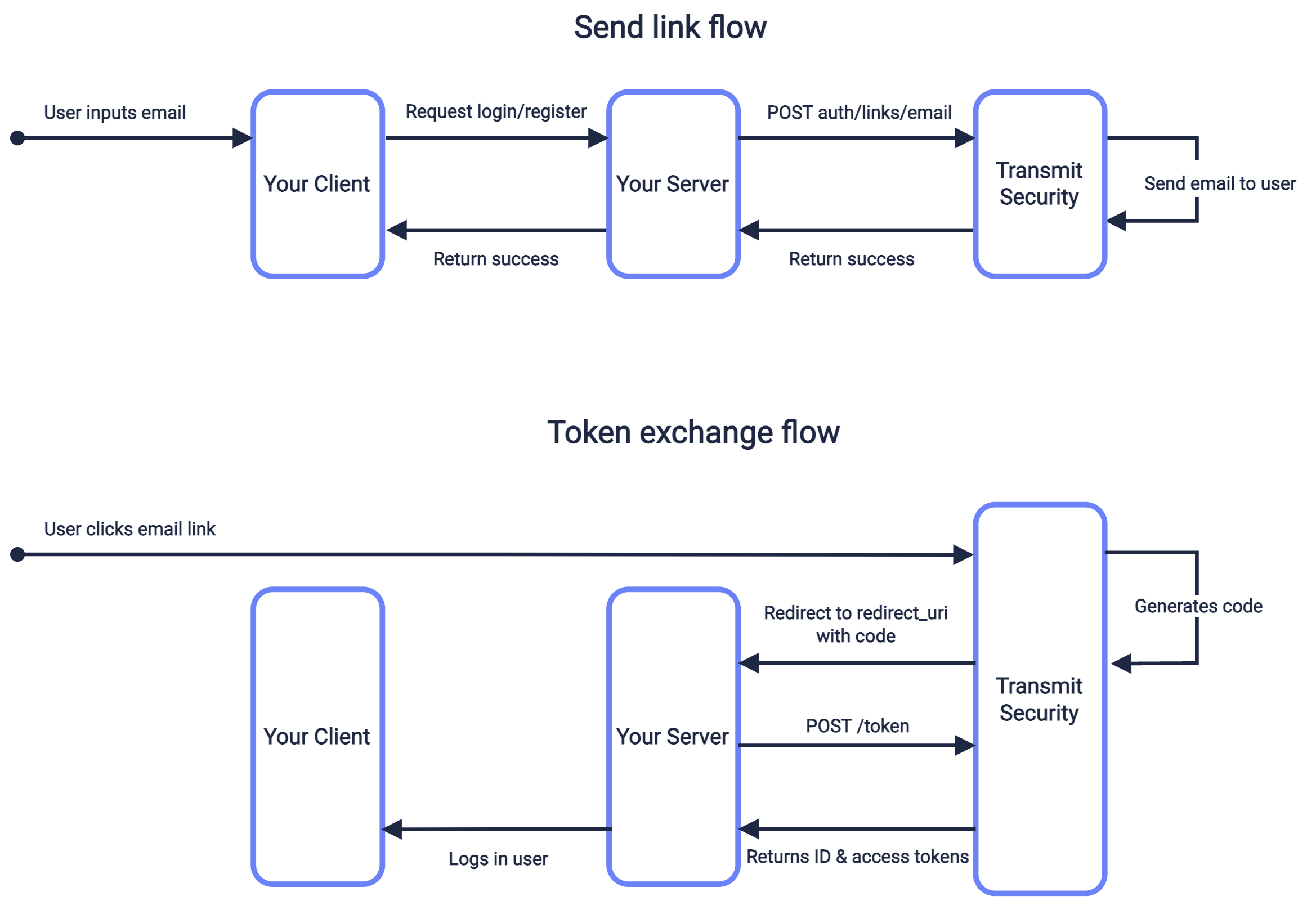 Magic links can be sent to users by email in order to authenticate existing users or create new users.