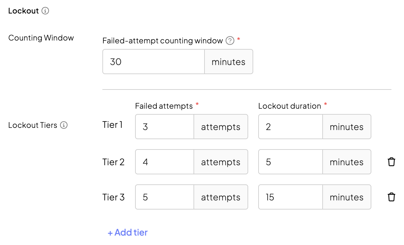 Progressive lockout tiers apply escalating lockout durations based on consecutive failed attempts. You can configure up to 10 tiers.
