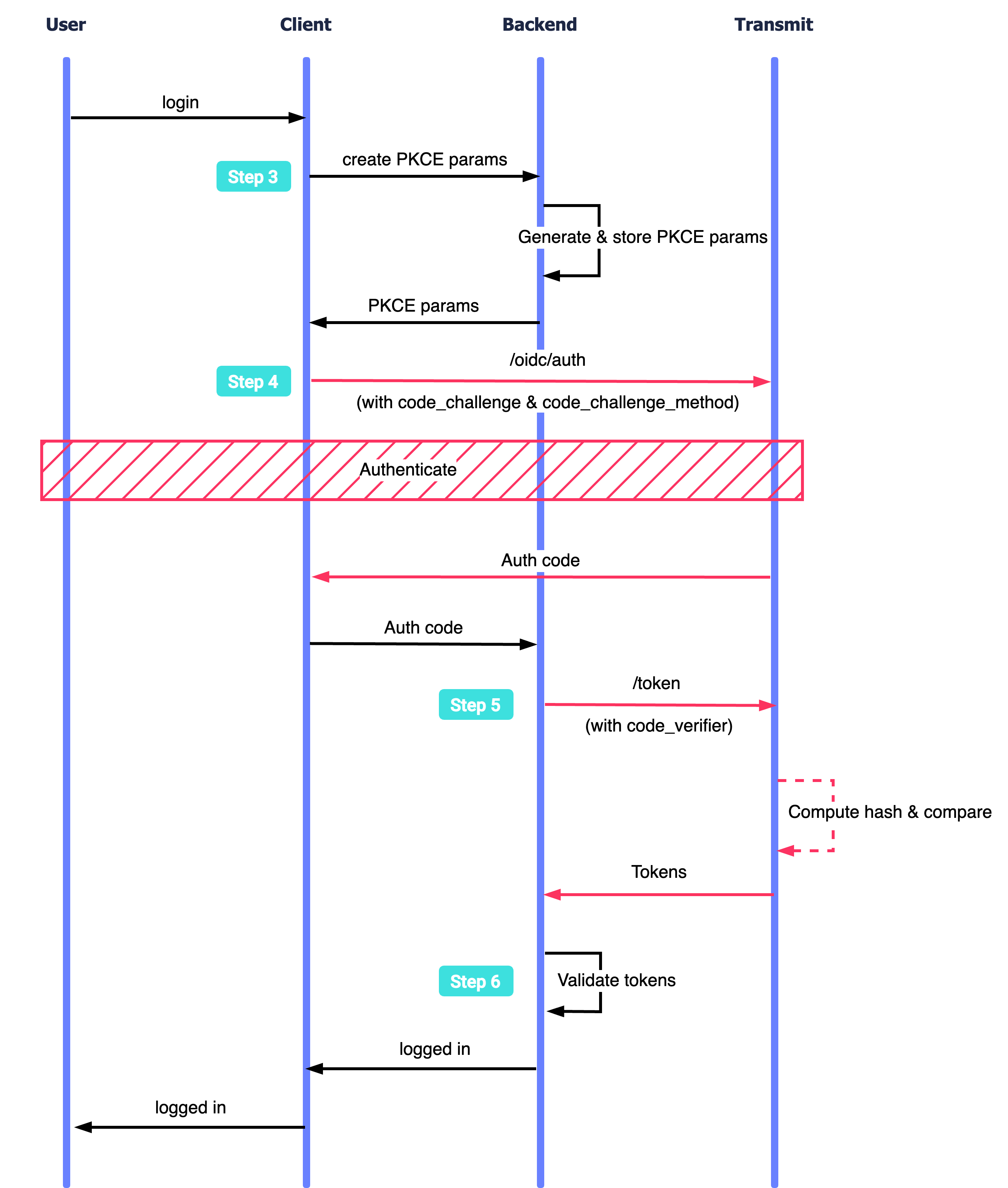 Below is an example of a login flow leveraging PKCE that can be implemented using the steps in this guide. Mosaic APIs are shown in pink along with the relevant integration step, described below.