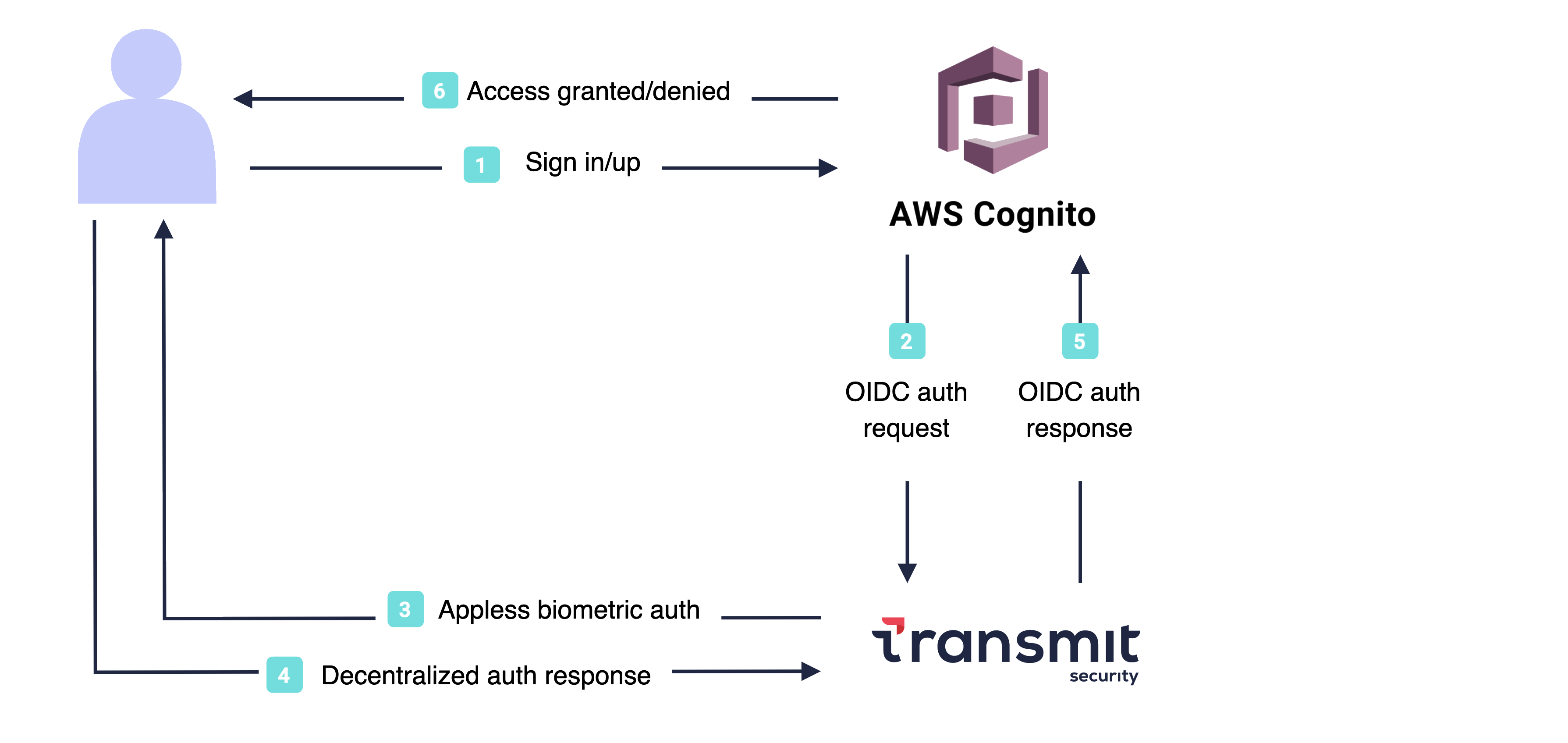 Since AWS Cognito is an IDP that provides password-based authentication only, AWS Cognito has partnered with Mosaic to seamlessly integrate into their authentication experience to passwordless authentication based on WebAuthn, which is based on FIDO2 biometrics. This solution requires end-users to register a single account with your business and then log in with a fingerprint or facial biometric on any channel and any device.
