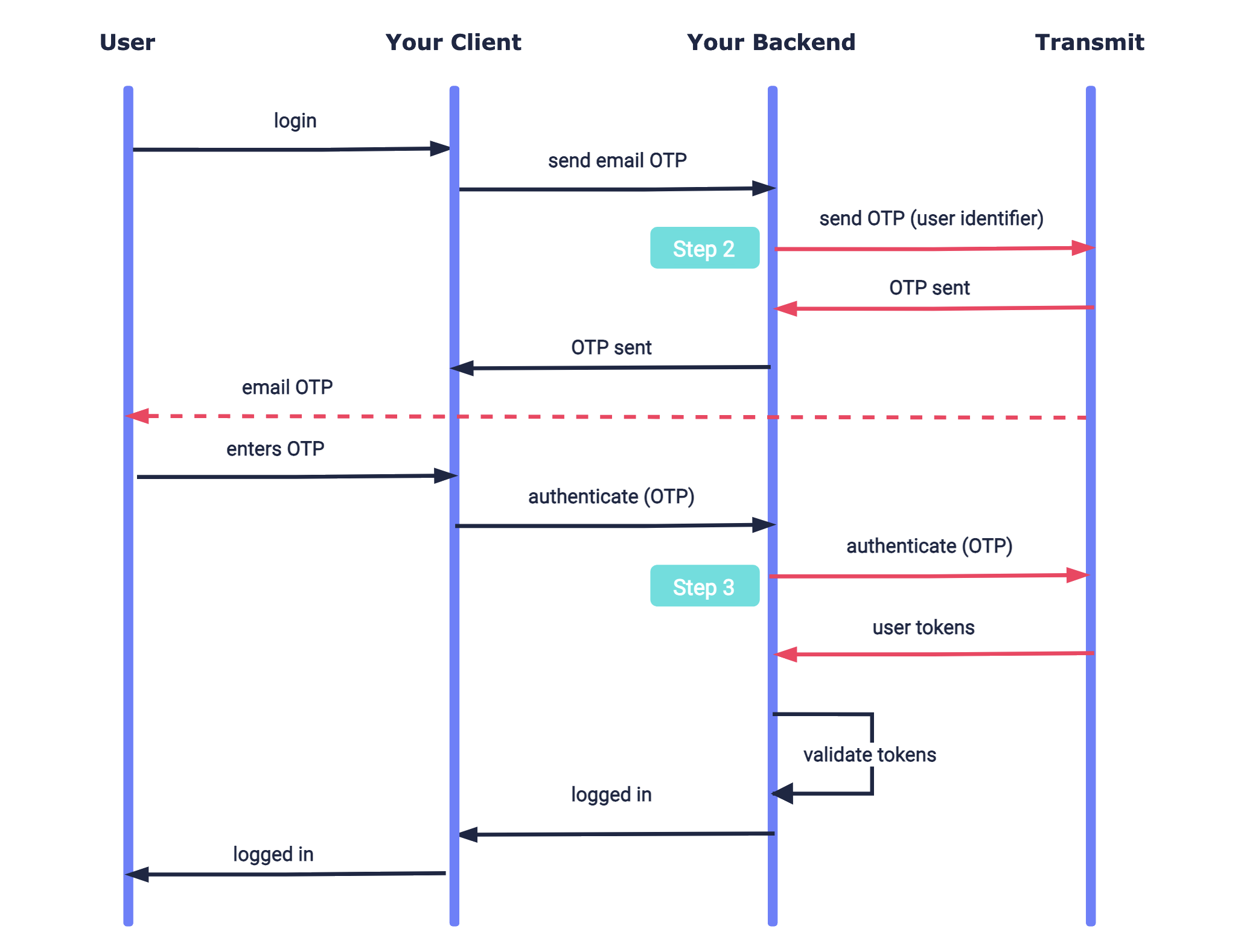 Here's an example of an email OTP integration. Mosaic APIs are shown in pink along with the relevant integration step.