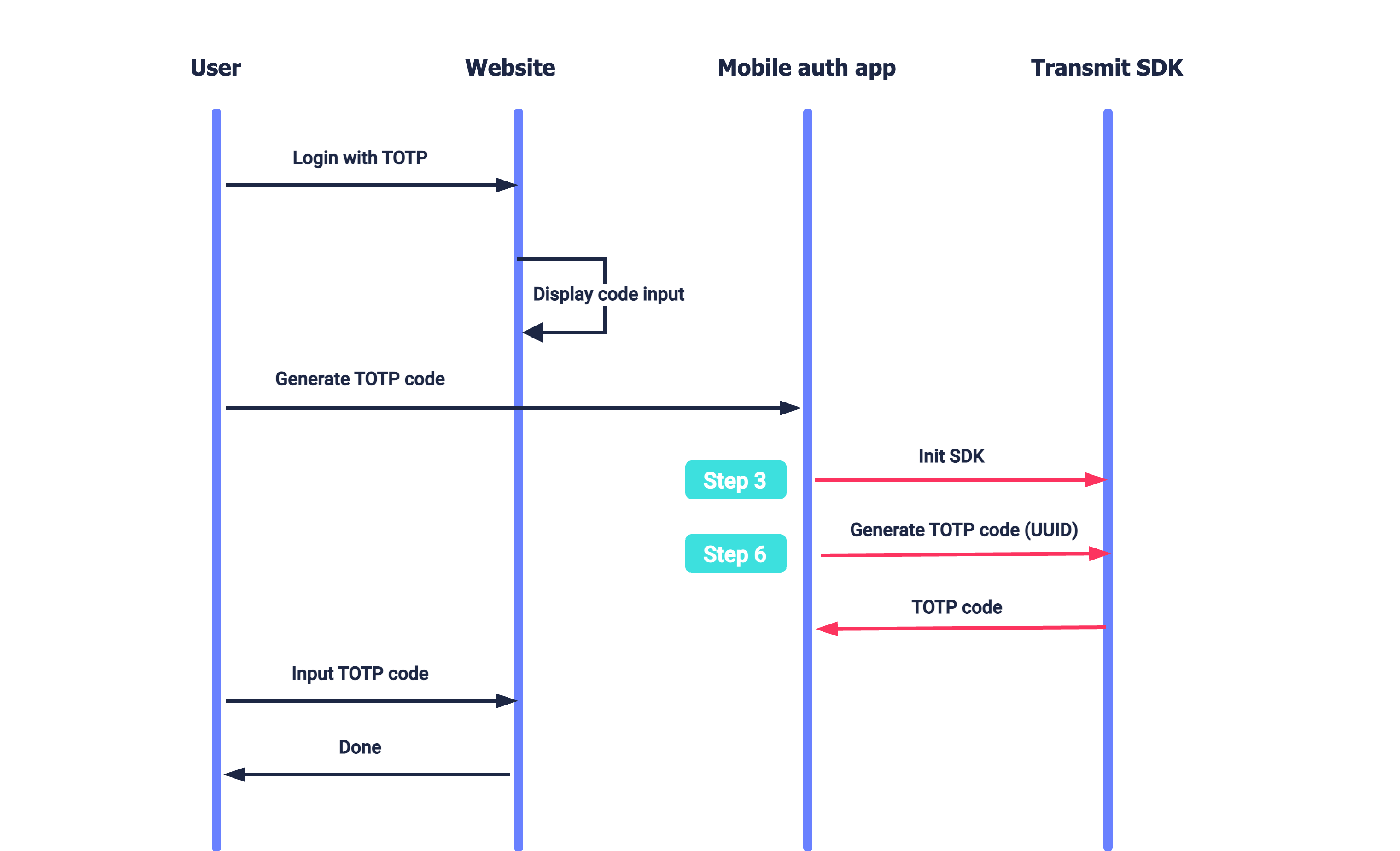 A user wants to log in to the website which requires TOTP code for authentication (see Login with TOTP). To obtain the TOTP code, the user proceeds to the authenticator app to generate the code. After initializing the SDK (Step 3), the app generates the TOTP code and displays it on the screen (Step 6). The user inputs this code on the website page.