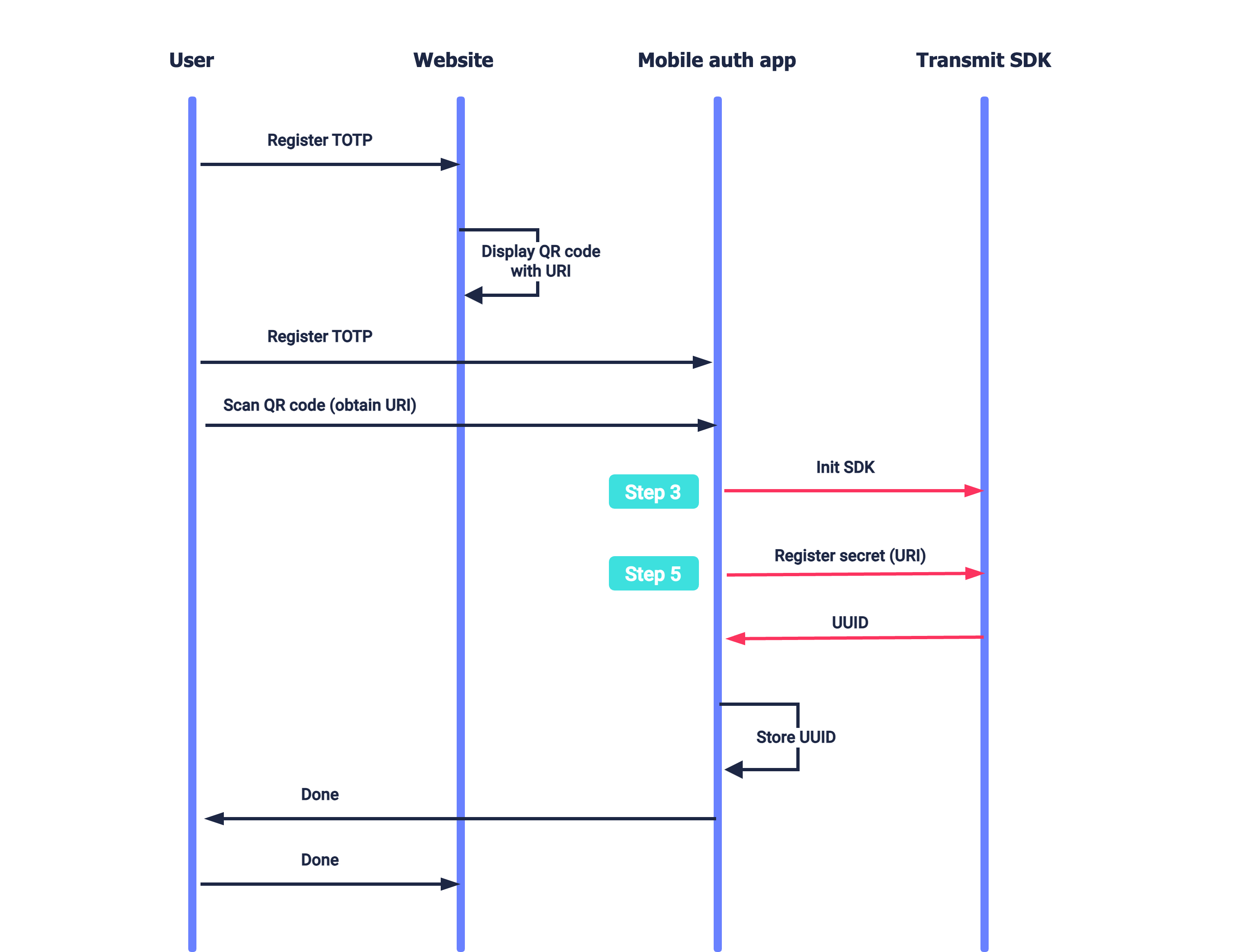 Suppose a user wants to enable TOTP login for your website (see Login with TOTP). The website presents a QR code that encodes the TOTP secret (and additional configuration). The user opens your authenticator app on their mobile device and scans the QR code. After initializing the SDK (Step 3), the authenticator app registers the secret for the user (Step 5). The user indicates to the website once the mobile flow is completed.