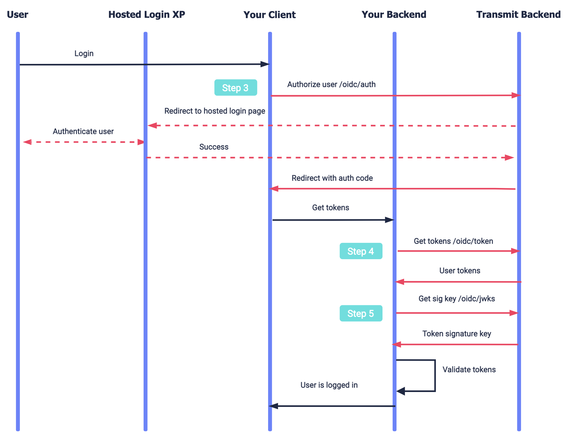 Here's an example of a login flow that can be implemented using the steps in this guide. Mosaic APIs are shown in pink along with the relevant integration step, described below. Note that logout isn't shown.