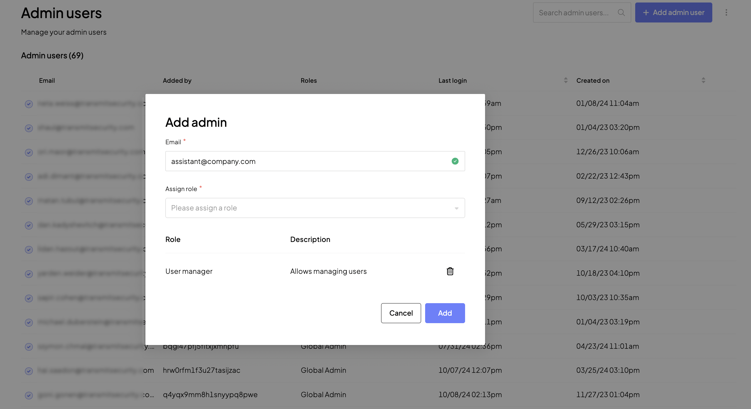 There you can invite new admin users or assign roles to existing users. Click + Add admin user, provide their email, and then select one or more roles. New accounts require validation: the users need to confirm their accounts by opening a link in the welcome email message.