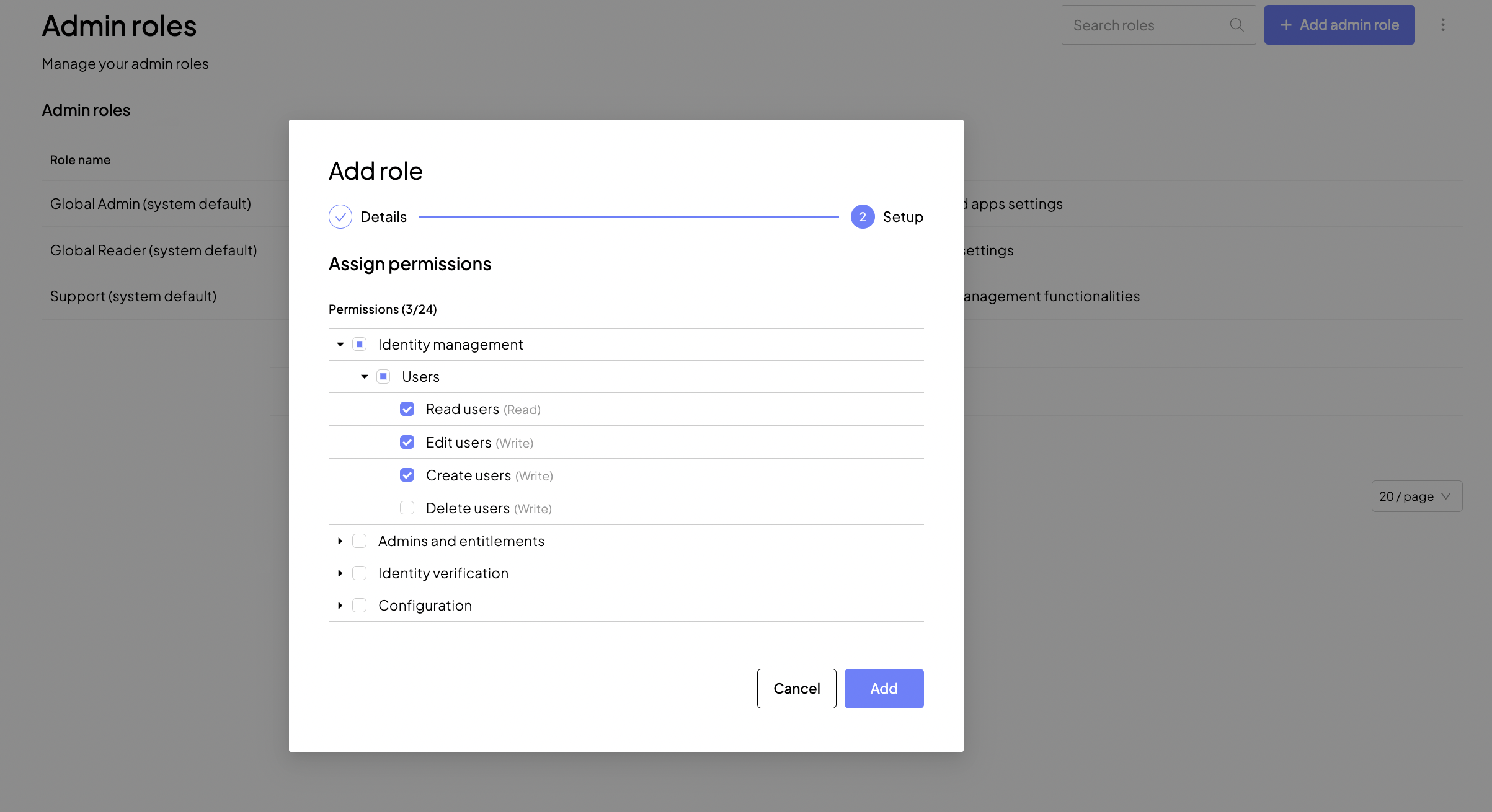 To create a custom role, select + Add admin role, and provide its name and description. Then, define permissions for this role. This permission tree is structured based on the organization of services within the Admin Portal and each service exposes specific permissions. For instance, for the Identity Management service, you will find four permissions under the Users subsection: read users, edit users, create users, and delete users. Assign permissions to the new role by checking the boxes next to them.