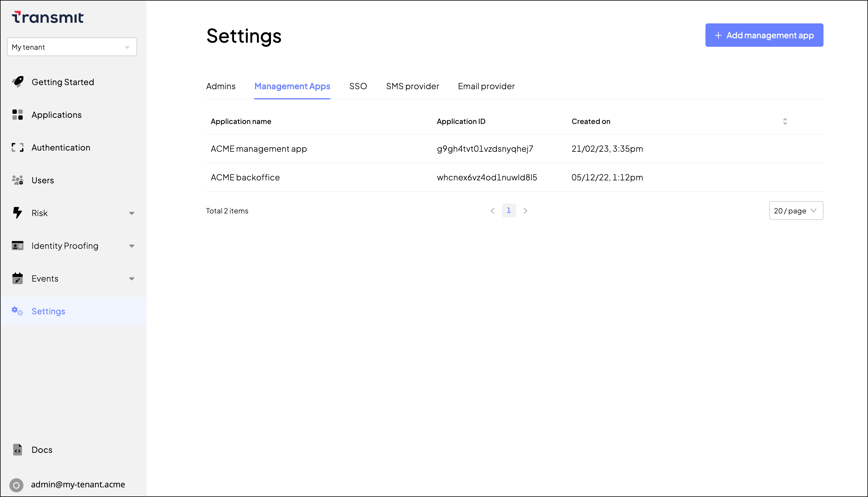 The Management Apps tab under Settings presents a list of all your management applications, with the name and ID for each app along with the date it was created.
