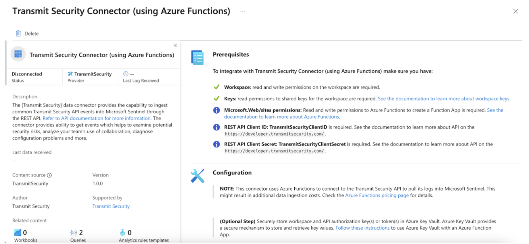 TransmitSecurityUserActivity_CL | where TimeGenerated > ago(1h)If no logs are found, ensure the Data Connector is configured correctly and that the Client ID and Client Secret values are accurate. You can also inspect the Azure Functions invocations logs for errors.