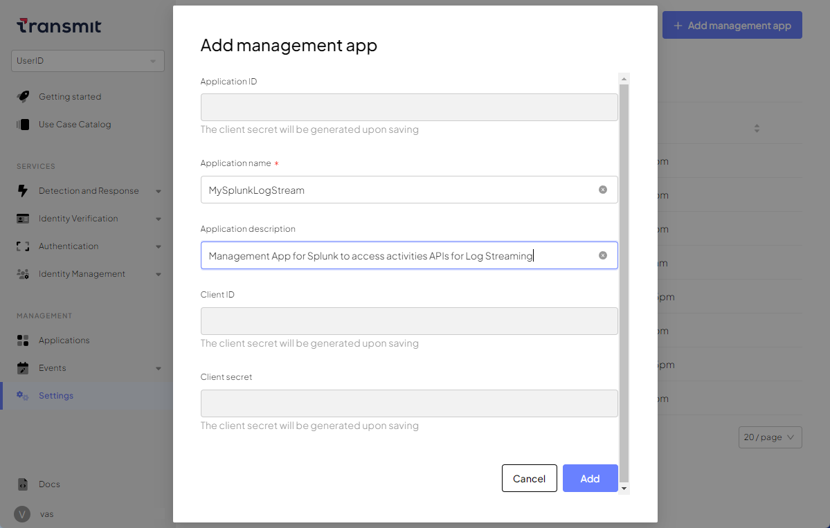In your Mosaic tenant, configure a management app. Give the app a suitable name, for example, MySplunkLogStream.