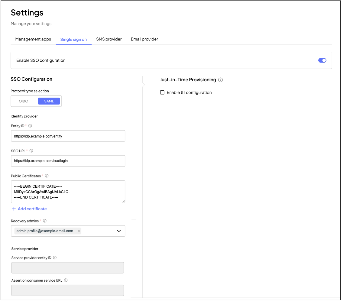 Streamline admin user onboarding and access management with Just-In-Time (JIT) SSO, which automatically creates or updates admin accounts upon their first SSO login. This eliminates the need for manual provisioning and ensures seamless access to the Admin Portal. See Just-In-Time Provisioning for Single Sign-On (JIT SSO).