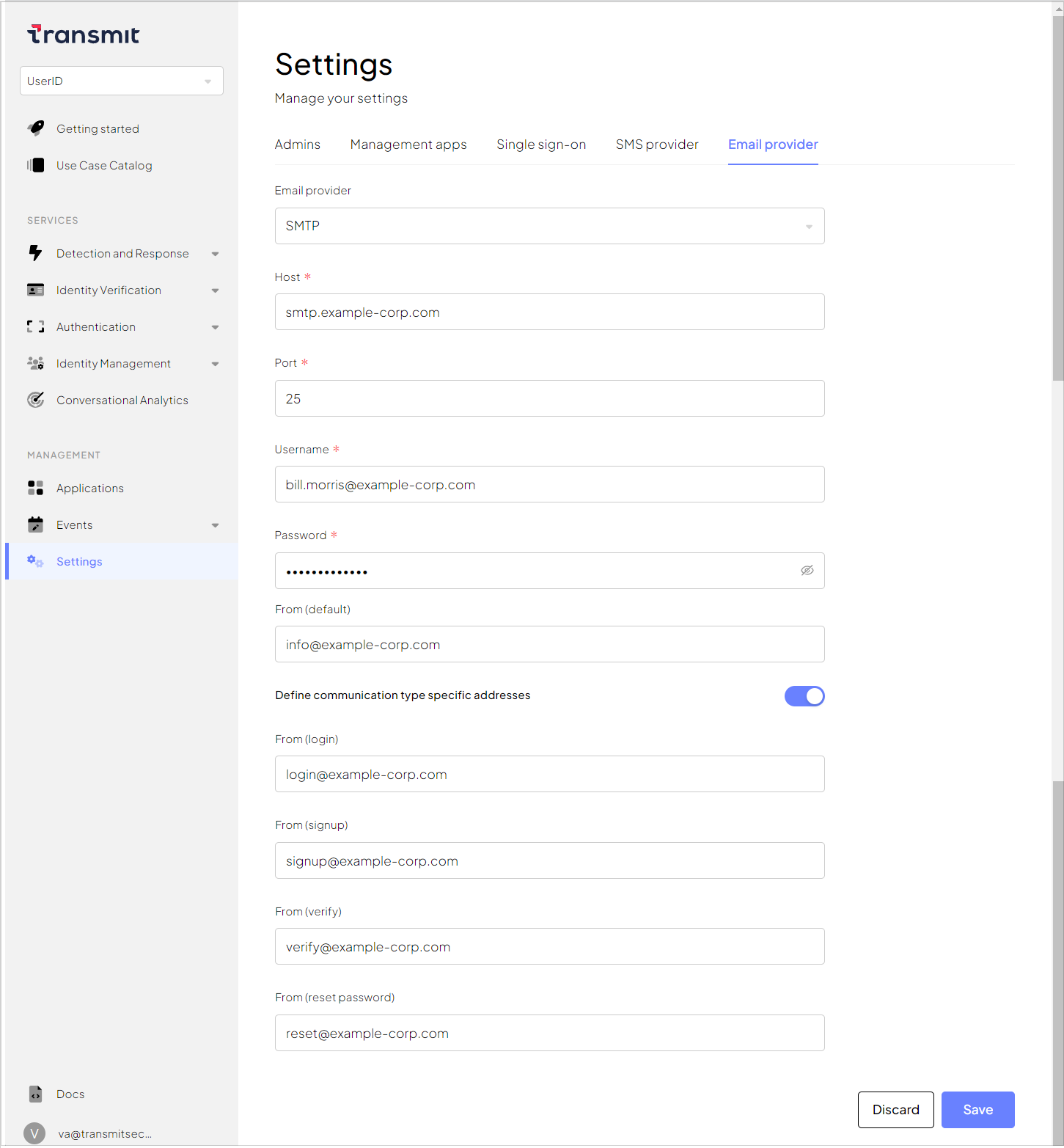 If you want to use custom email addresses depending on the flow, toggle on Define communication type specific addresses and enter the email: