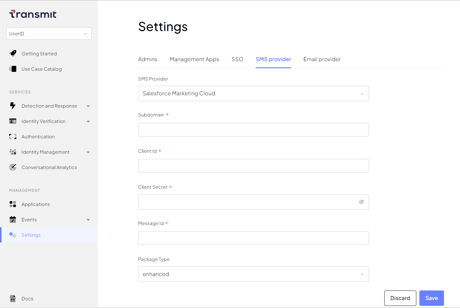 From Settings > SMS provider, select Salesforce Marketing Cloud as the SMS provider and configure the parameters: