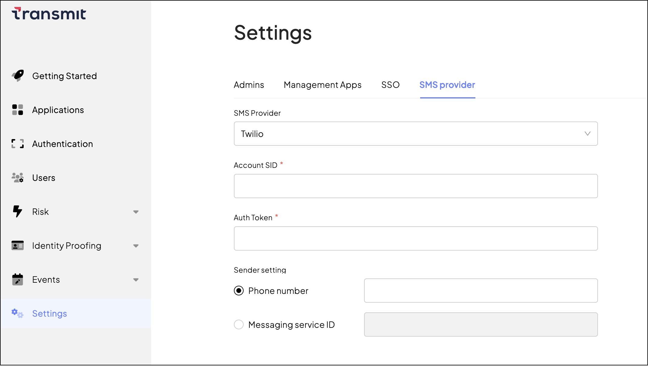From Settings > SMS provider, select Twilio as the SMS provider and configure the following settings: