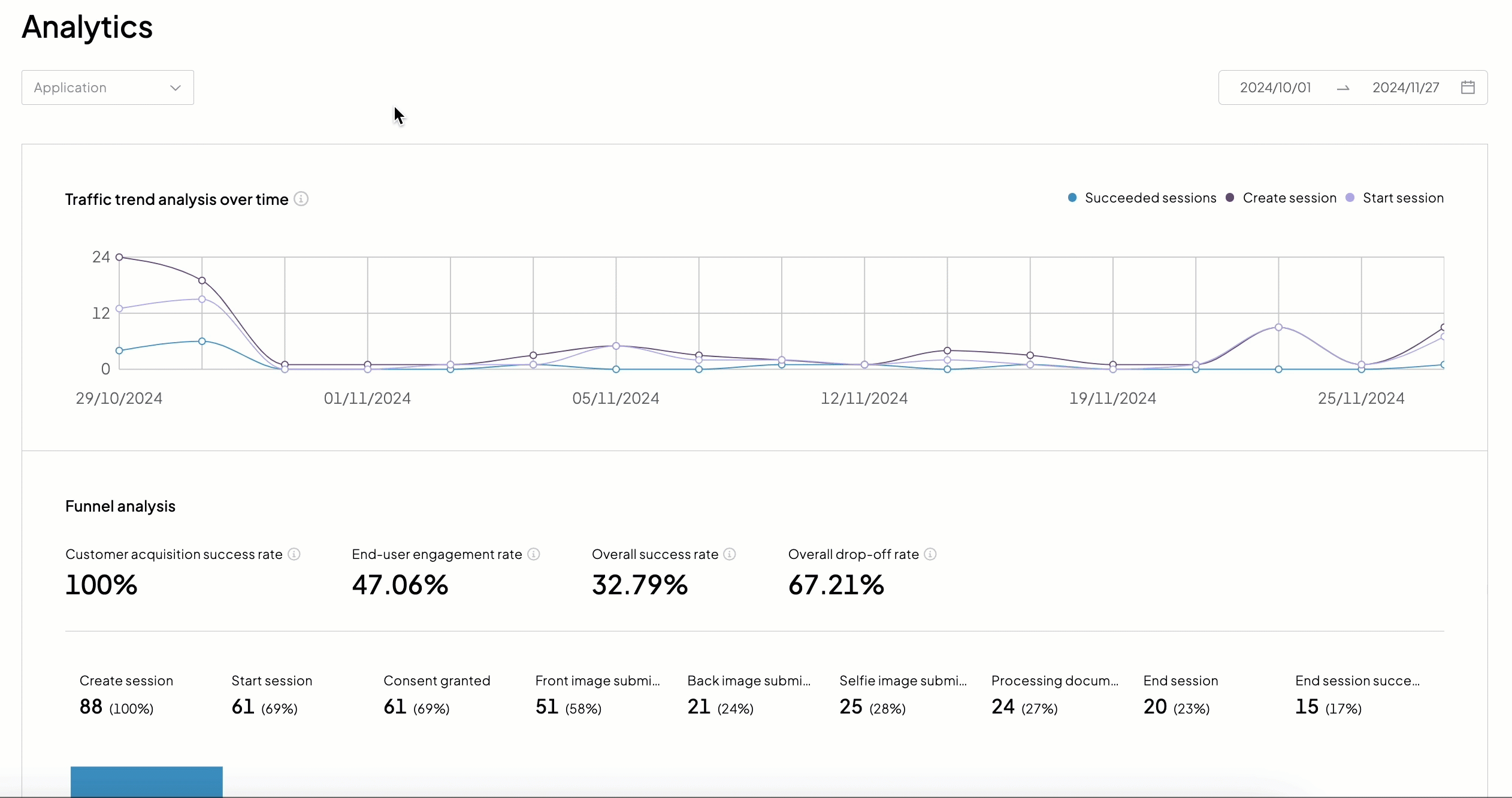 The Funnel analysis provides statistics on how each stage of the verification process compares to the previous one. It provides vital metrics like the total number of created sessions, started sessions, and completed sessions. Then, it helps identify drop-off points and understand user engagement rate. In other words, by examining the funnel you'll see how many times your app requested an identity verification from users, how many users actually started the process and completed all the steps.