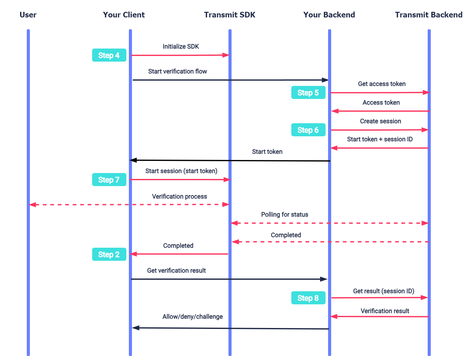 After initializing the SDK (Step 4), your backend continues by getting an access token (Step 5) and creating a session (Step 6). After this, your client starts a session (Step 7). The SDK executes the verification process with the user using the Mosaic identity verification experience. Once all the required images are submitted, Mosaic starts processing the verification while the SDK polls for its status. Once processing is completed, the SDK notifies the app (Step 2) so it can obtain the verification result (Step 8).