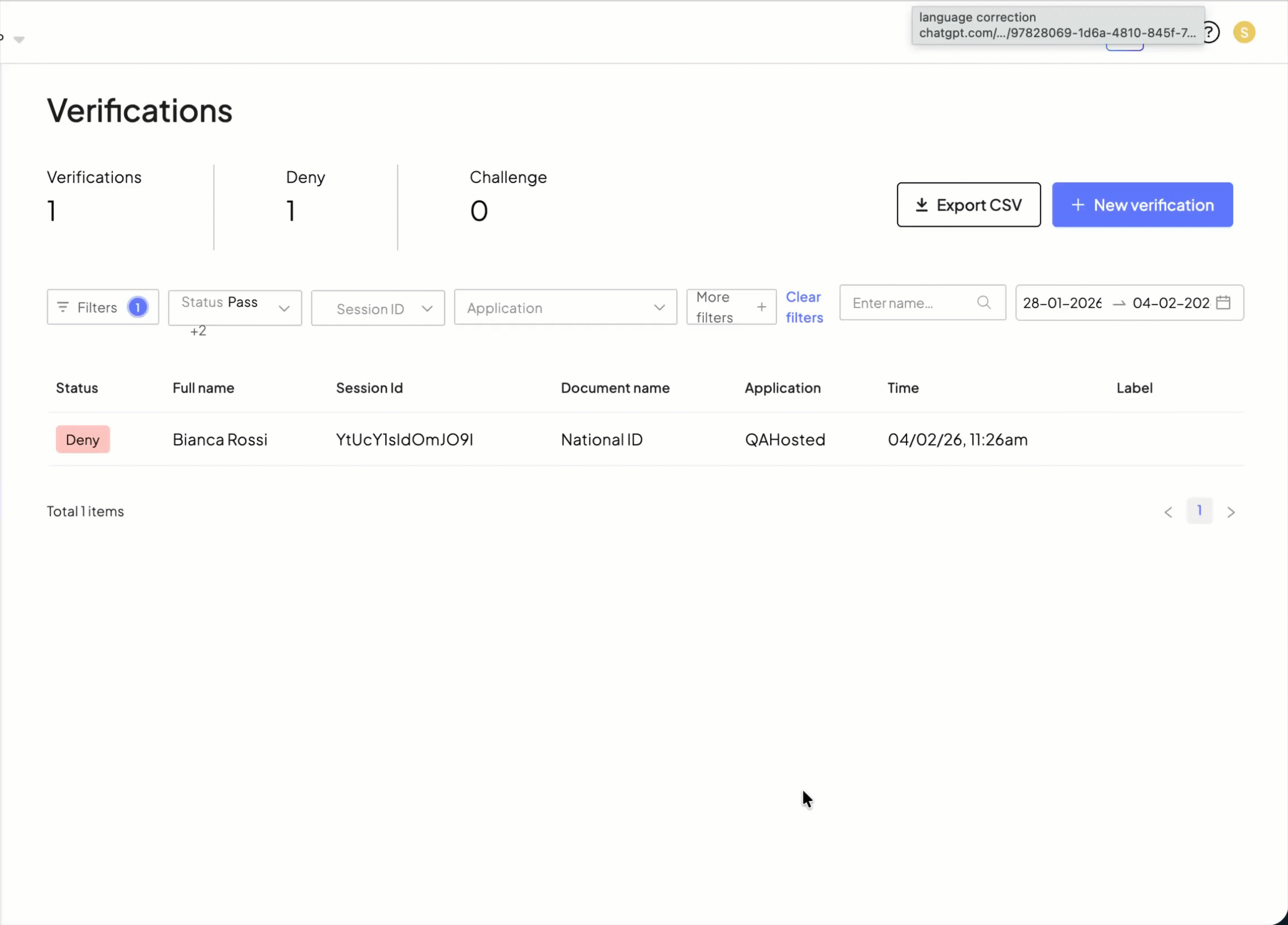In the list, you can see all verifications, with status, session ID, user name and document type (if known), application name, label (if assigned), and the date for each verification. Filter verifications by status, label, date, etc. You can also export the verifications to your external analytics systems for further persistency and offline analytics.