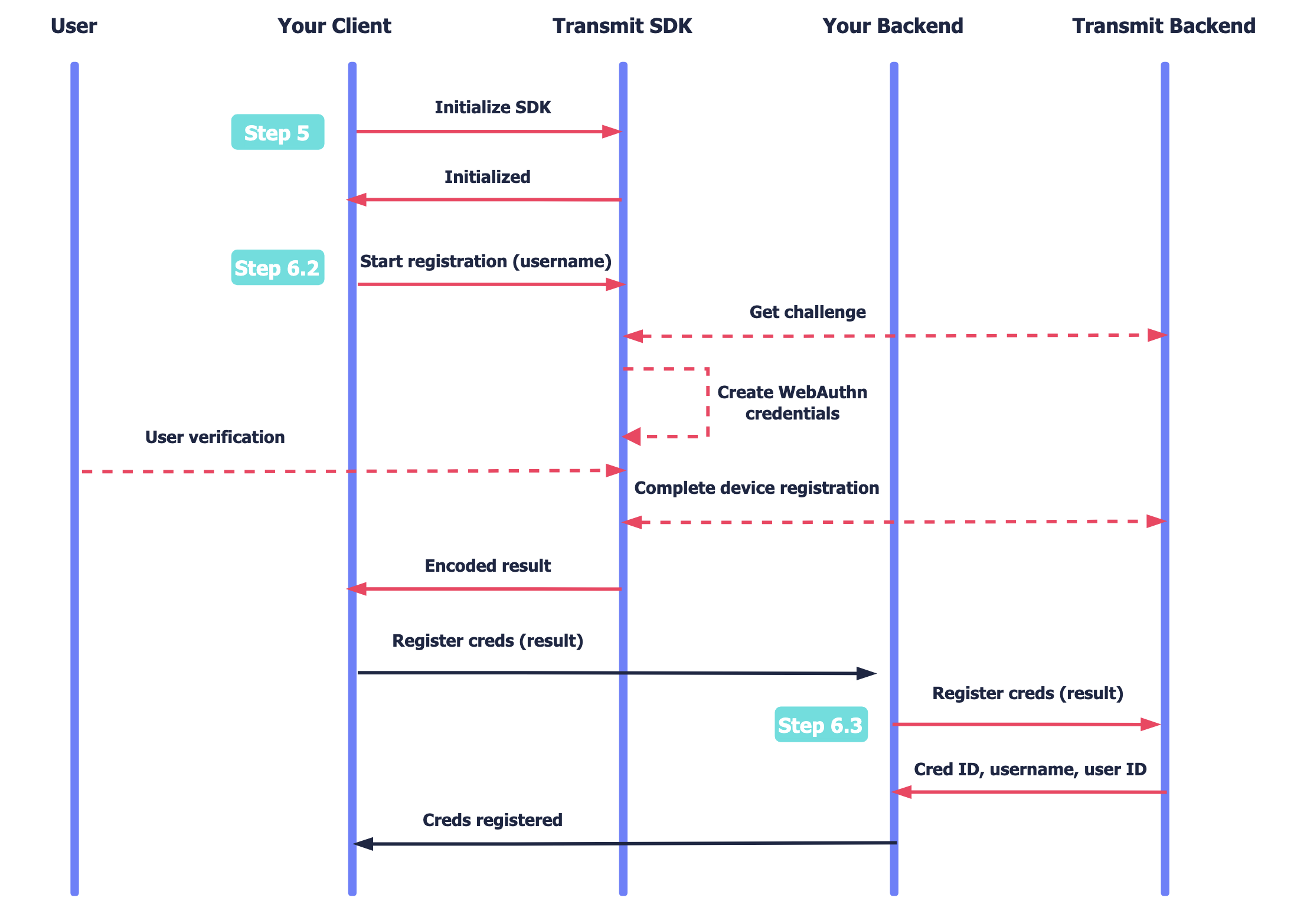 After initializing the SDK, the client validates that the platform authenticator is available. Once the user is ready to register their credentials, the SDK tells the device to create credentials, which may require the user to verify (e.g., via device biometrics). Once completed, the encoded WebAuthn result is returned to the client to complete the registration process via their backend. Once registration is completed, the user's credentials are registered and can be used to approve payments.