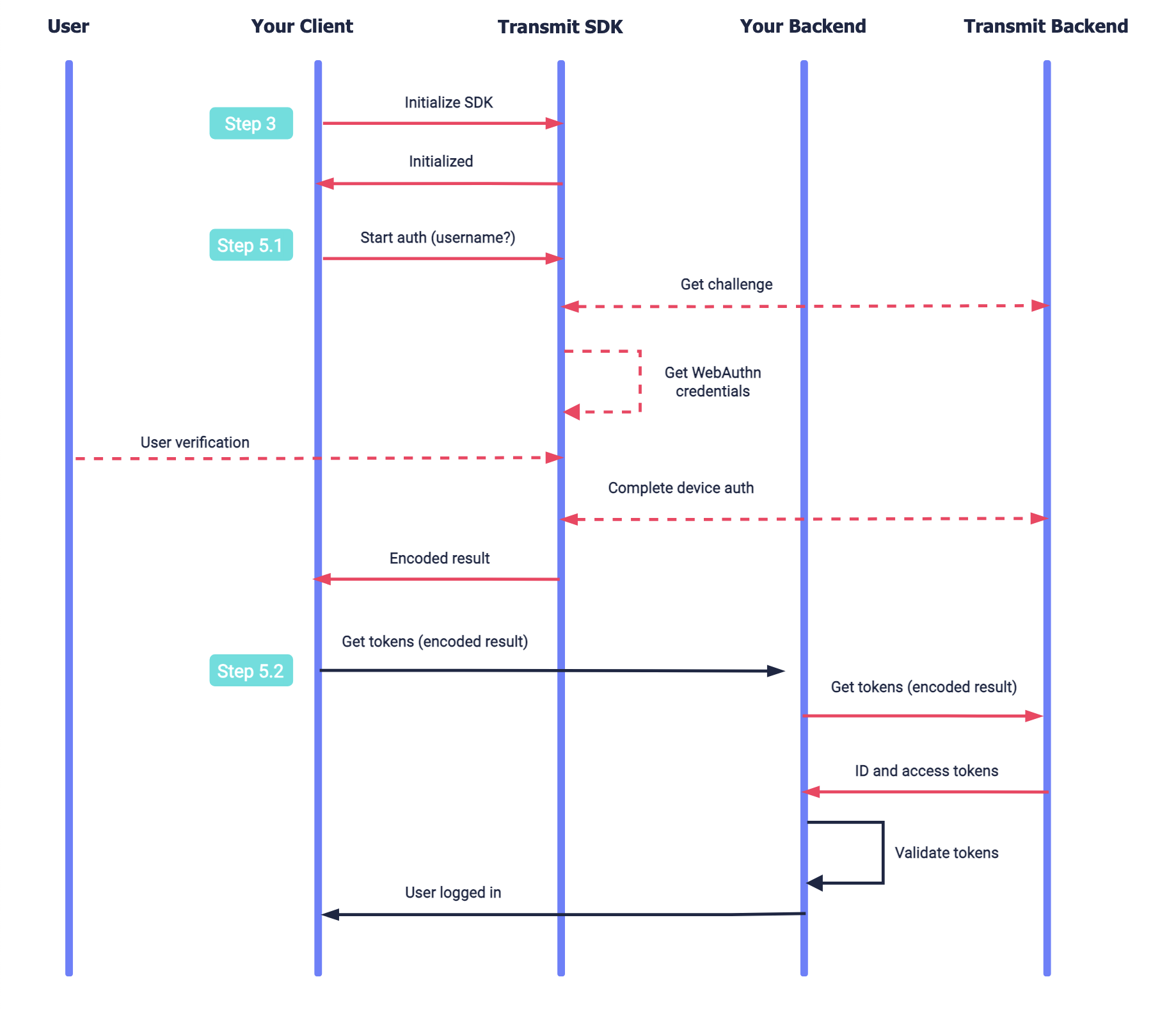 The SDK is initialized. Once the user is ready to authenticate, the SDK tells the browser to get credentials, which may require the user to verify (e.g., via TouchID). Once completed, a user access token is returned to your client backend and the user is logged in.