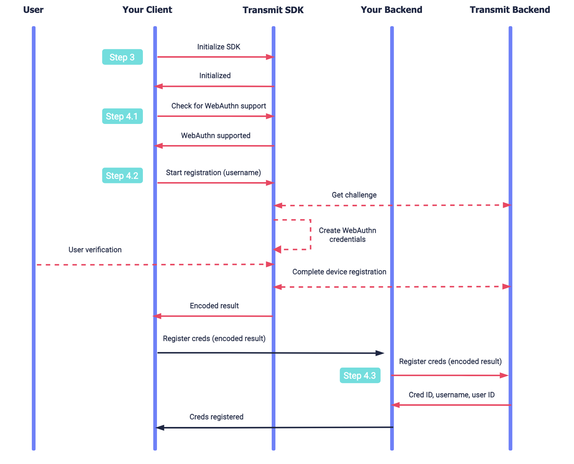 After initializing the SDK, the client validates that the device supports WebAuthn. Once the user is ready to register their credential, the SDK tells the browser to create credentials, which may require the user to verify (e.g., via TouchID). Once completed, the user's credential is registered and can be used going forward to log in.